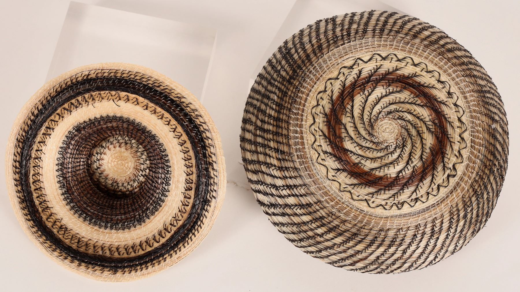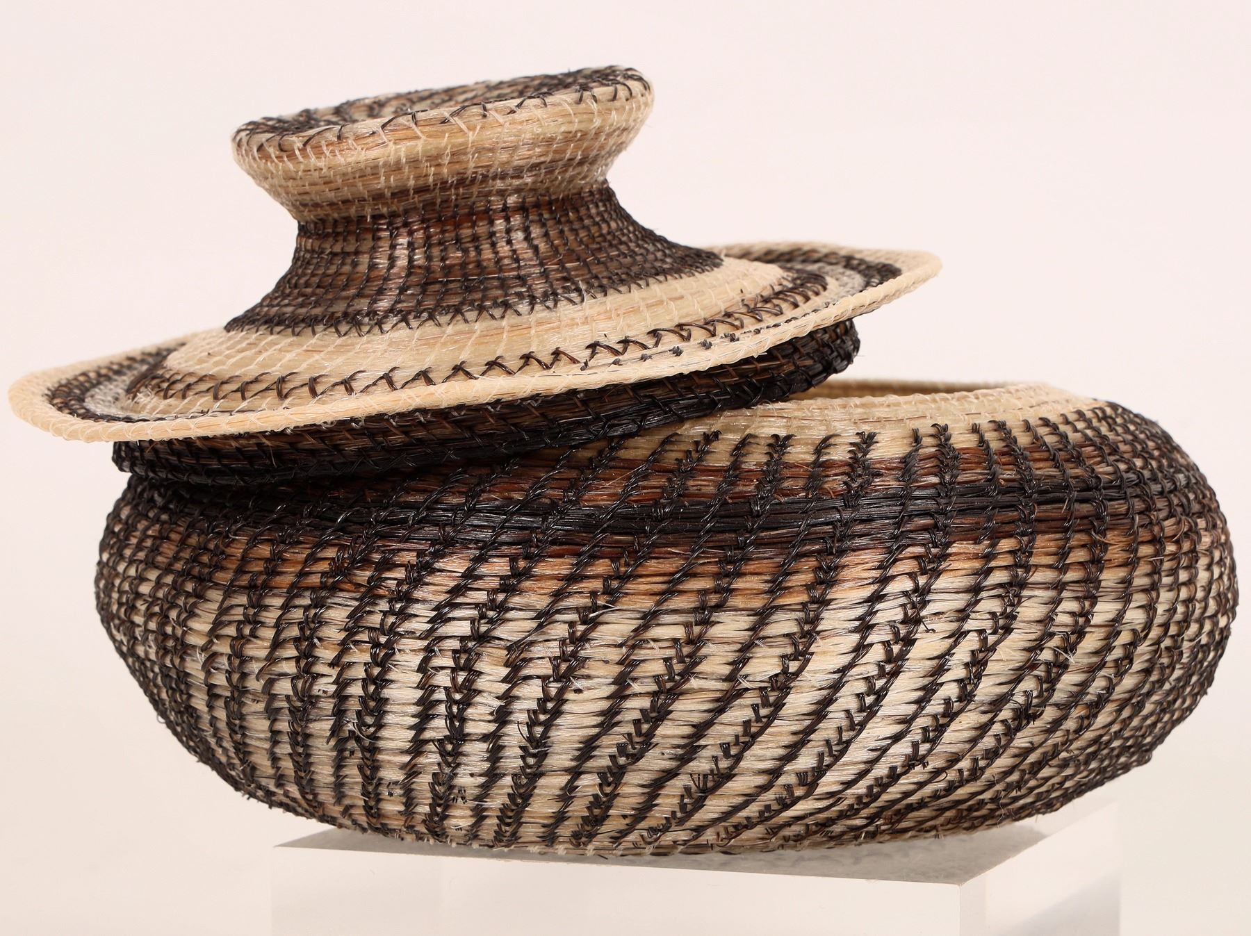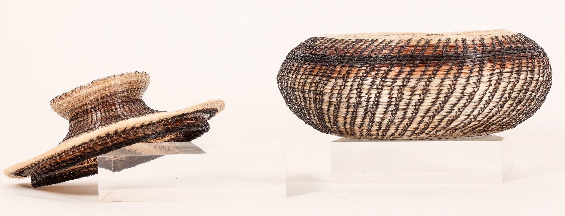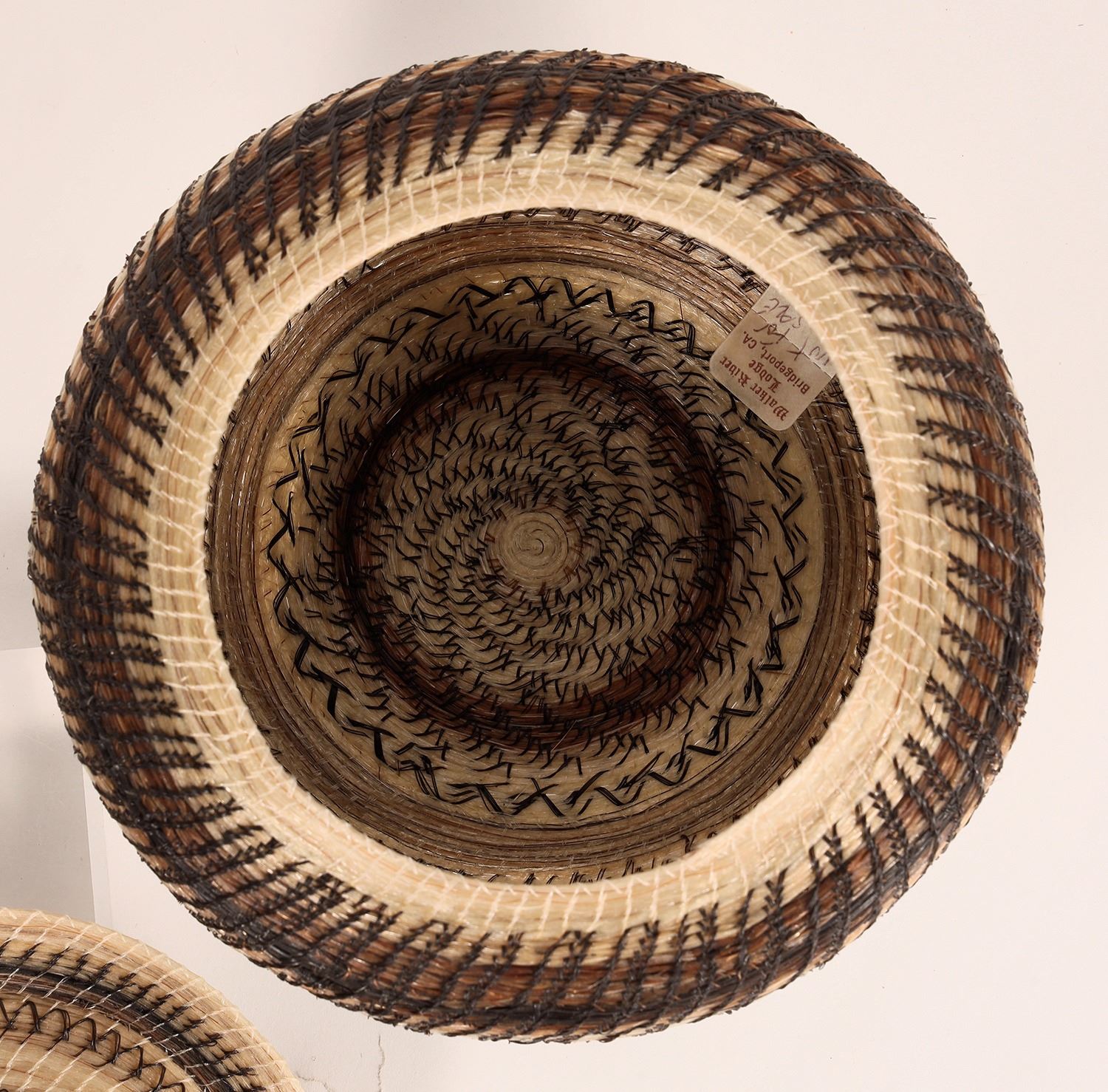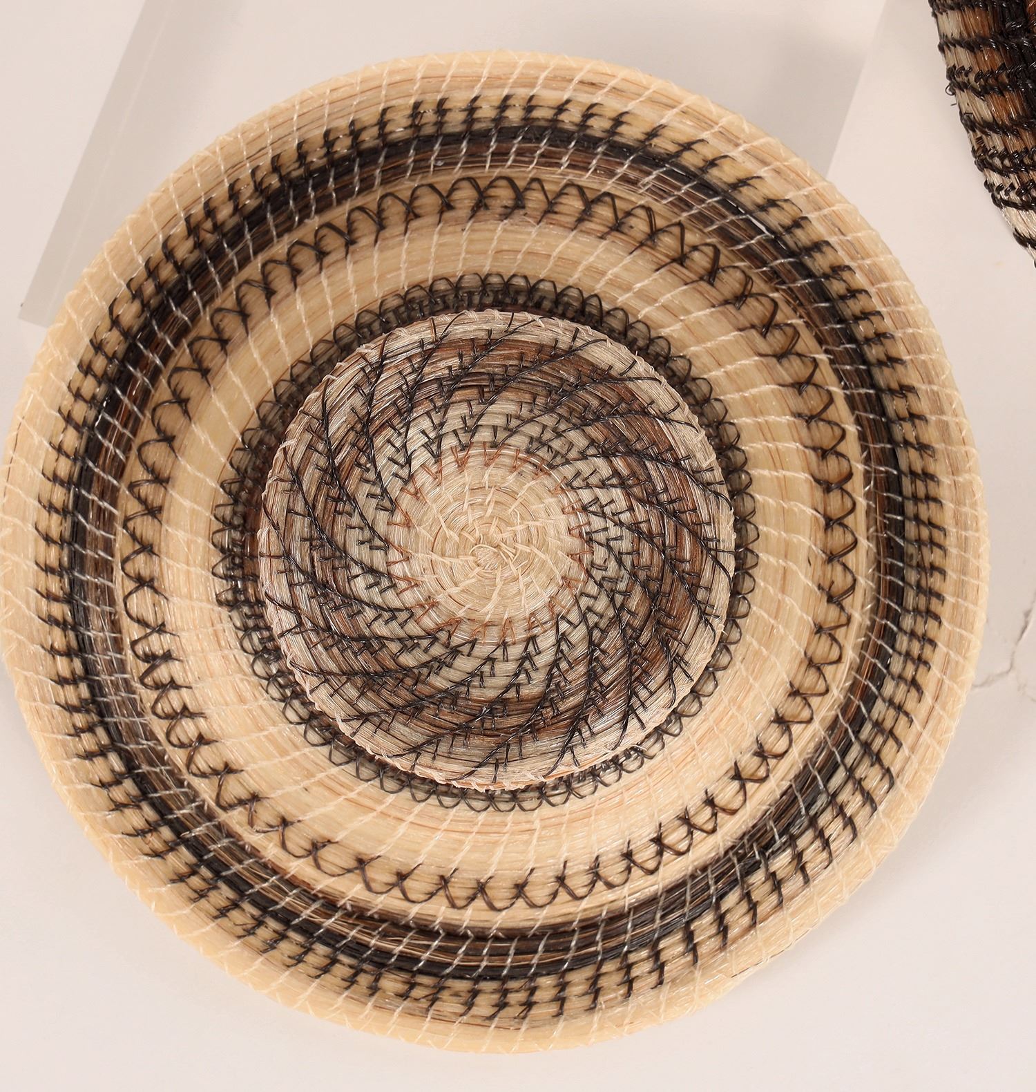 7.5" diameter 4" tall. Lid with alternating light and dark brown horsehair, body with patterned colored horsehair. Identification by N. Delorme. Fred Wedertz Collection of Bridgeport. Made by the Rodgers family in Schurz NV near Walker lake.