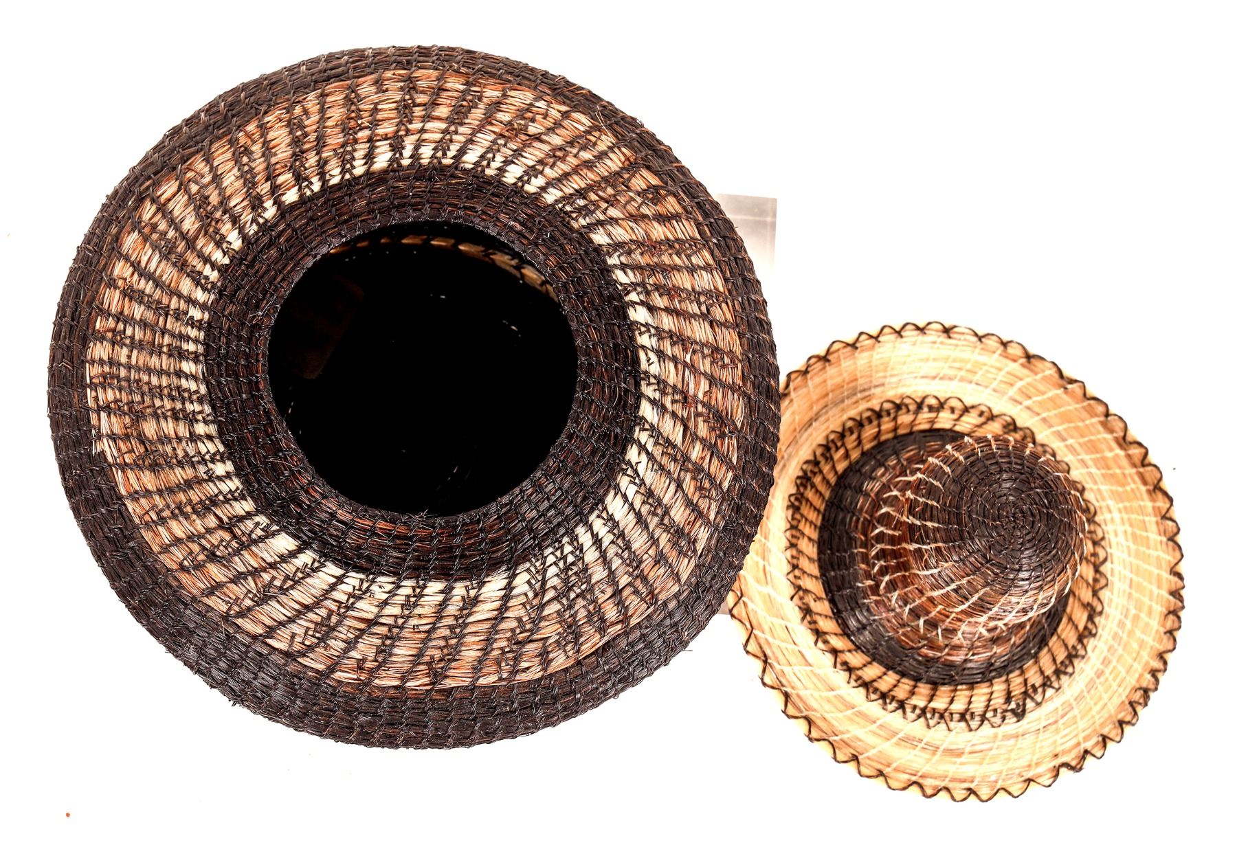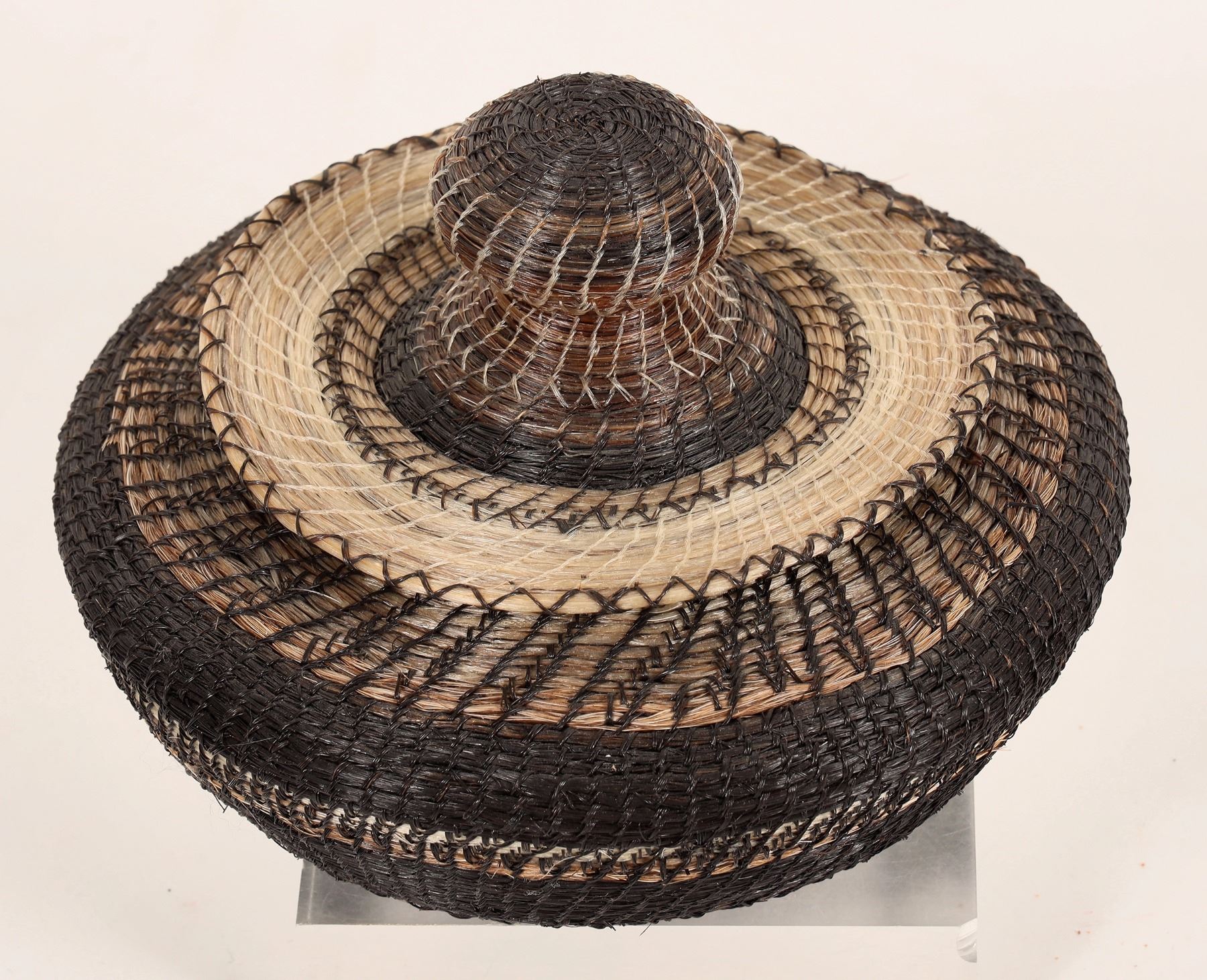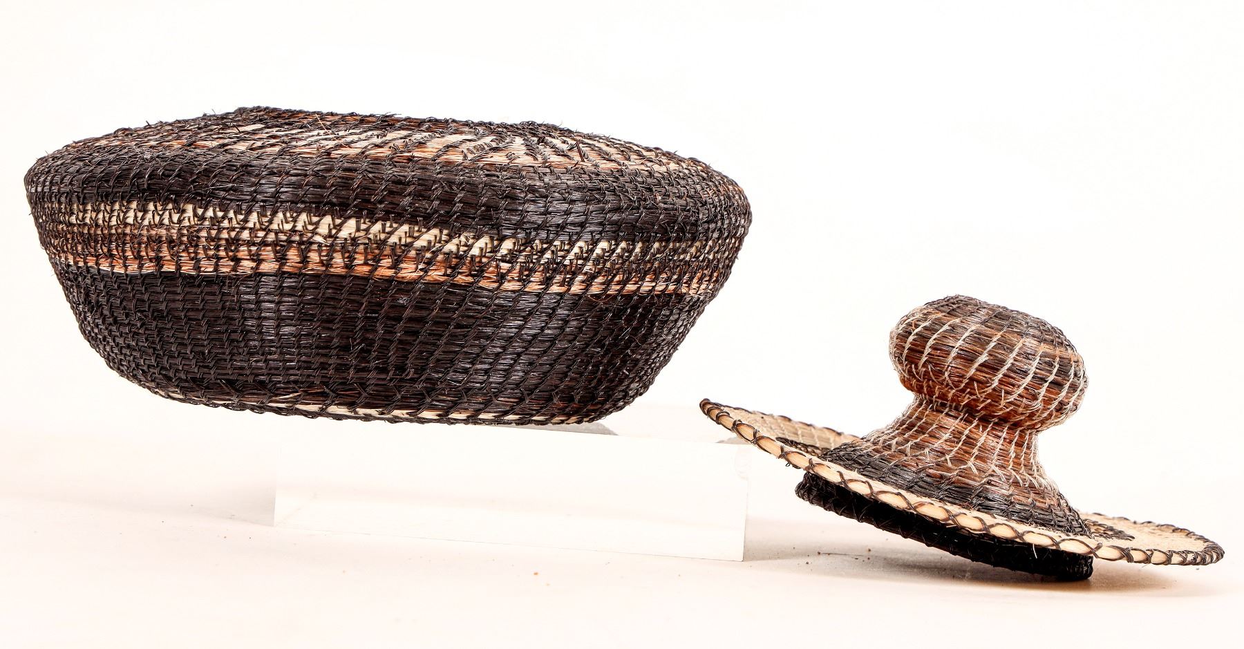 6.5" diameter 5" tall. Lid with mostly lighter colored horsehair and dark knob, body with generally darker colored horsehair. Identification by N. Delorme. Fred Wedertz Collection of Bridgeport. Made by the Rodgers family in Schurz NV near Walker lake.