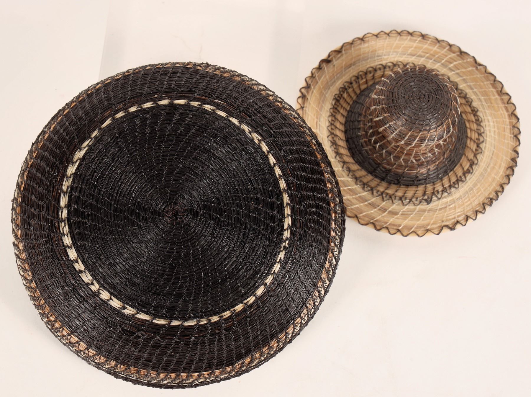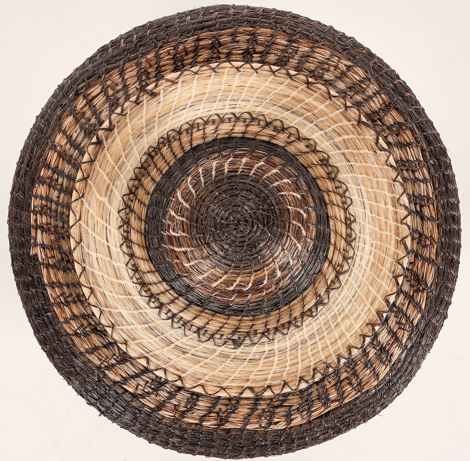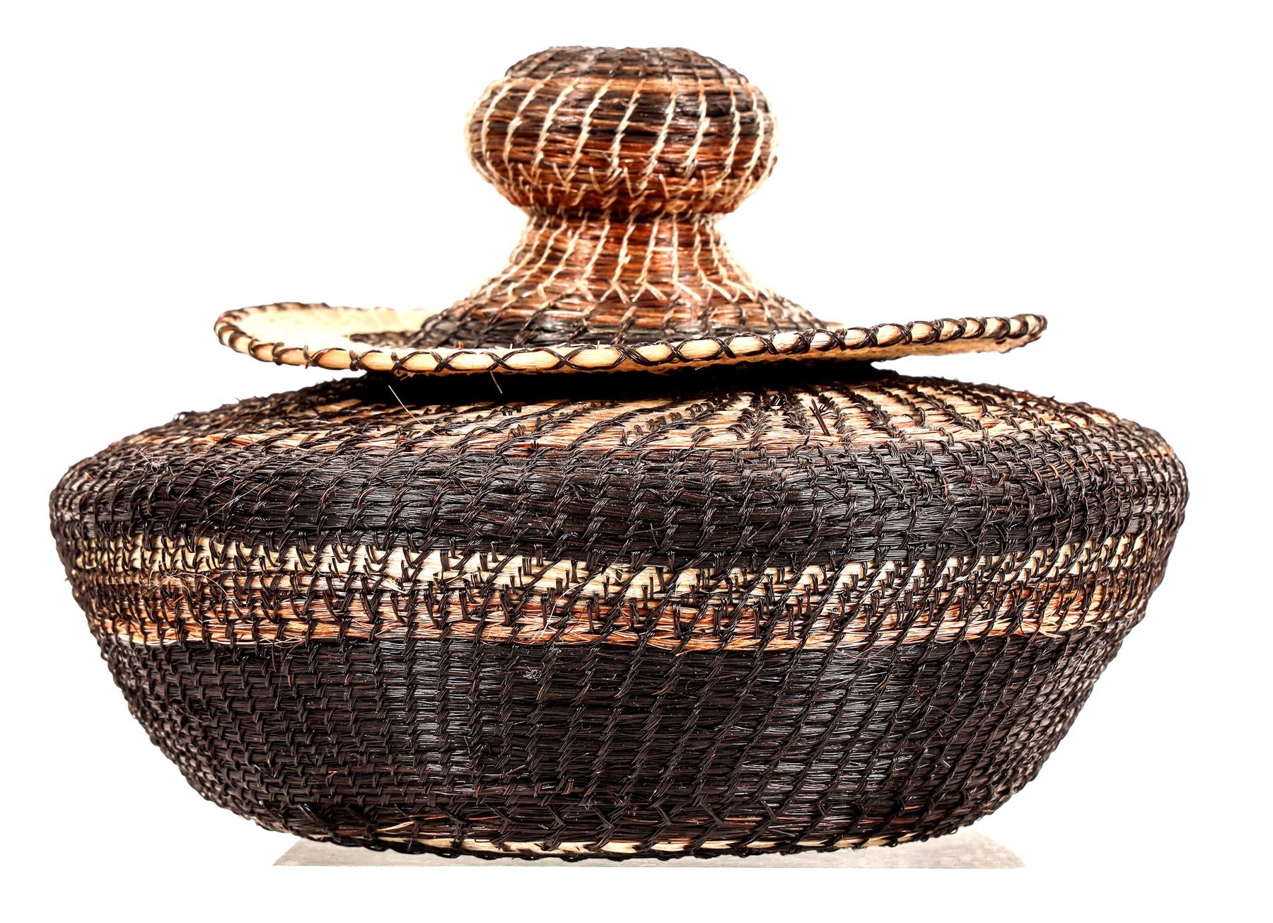 6.5" diameter 5" tall. Lid with mostly lighter colored horsehair and dark knob, body with generally darker colored horsehair. Identification by N. Delorme. Fred Wedertz Collection of Bridgeport. Made by the Rodgers family in Schurz NV near Walker lake.