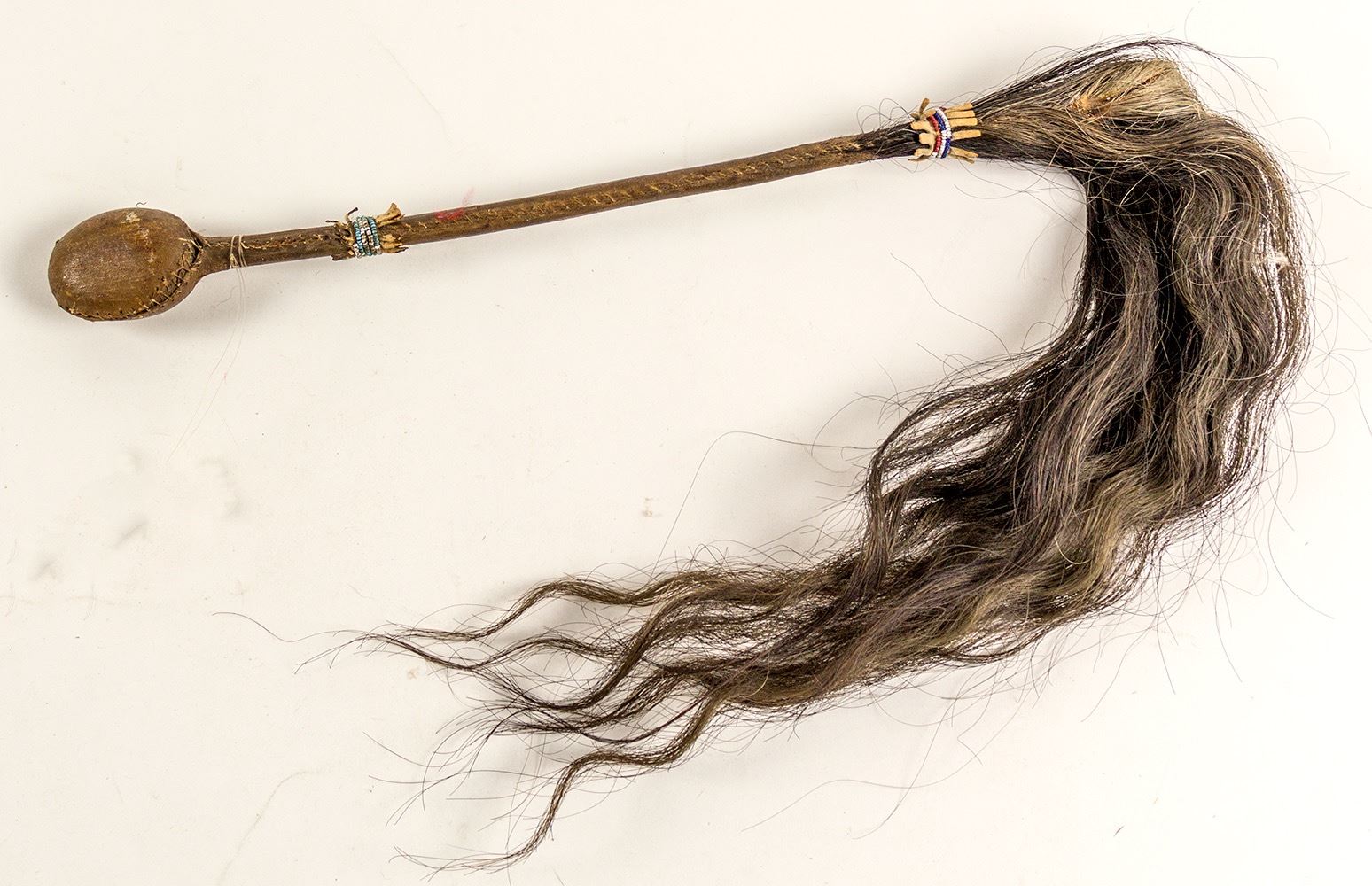 This is an American Indian war club with horsehair decoration and light beading. Piece measures 19" long at the handle, with a 16" horsehair extension. Great addition to any American Indian collection. Date: Location: HWAC# 56405