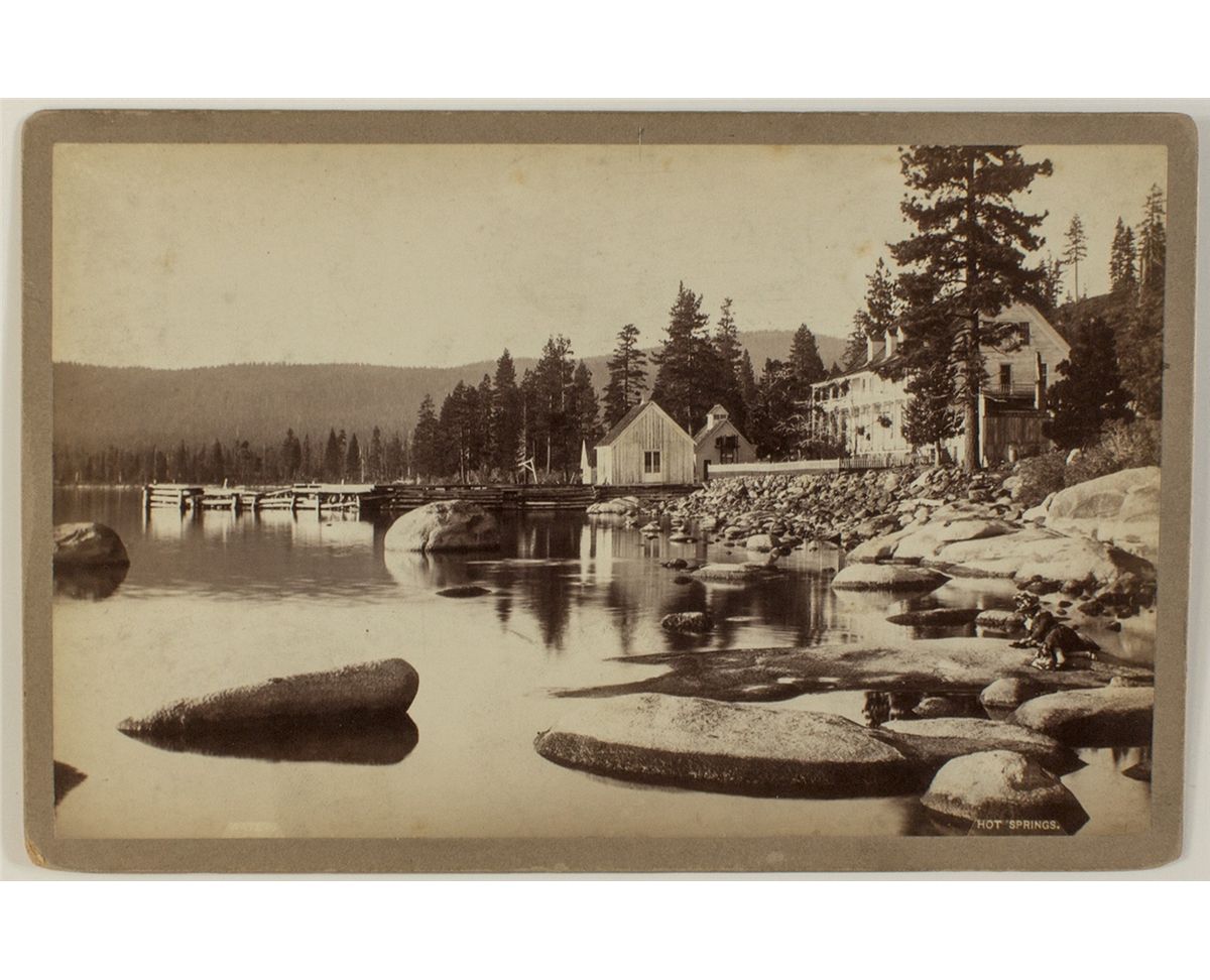 When one thinks of Lake Tahoe, hot springs do not necessarily come to mind. Yet there is one small spot in Lake Tahoe were the lake water is indeed a hot spring. This photograph appears to have been taken alongside the Hot Springs Hotel. In the lower right corner, a woman can be seen relaxing on one of the large rocks and looking into the water. The photographer is identified as R.J. Waters, who was listed in Berkeley, CA at the time. Please note that this location for Waters is not listed in Mautz. The matte measures 6.45" x 4.20" and the photograph 6.10" x 3.80" The focus is sharp and the contrast is medium to high. There are some stains on the top left side of the photograph.City: BrockwayCounty: El DoradoState: CADate: c1880