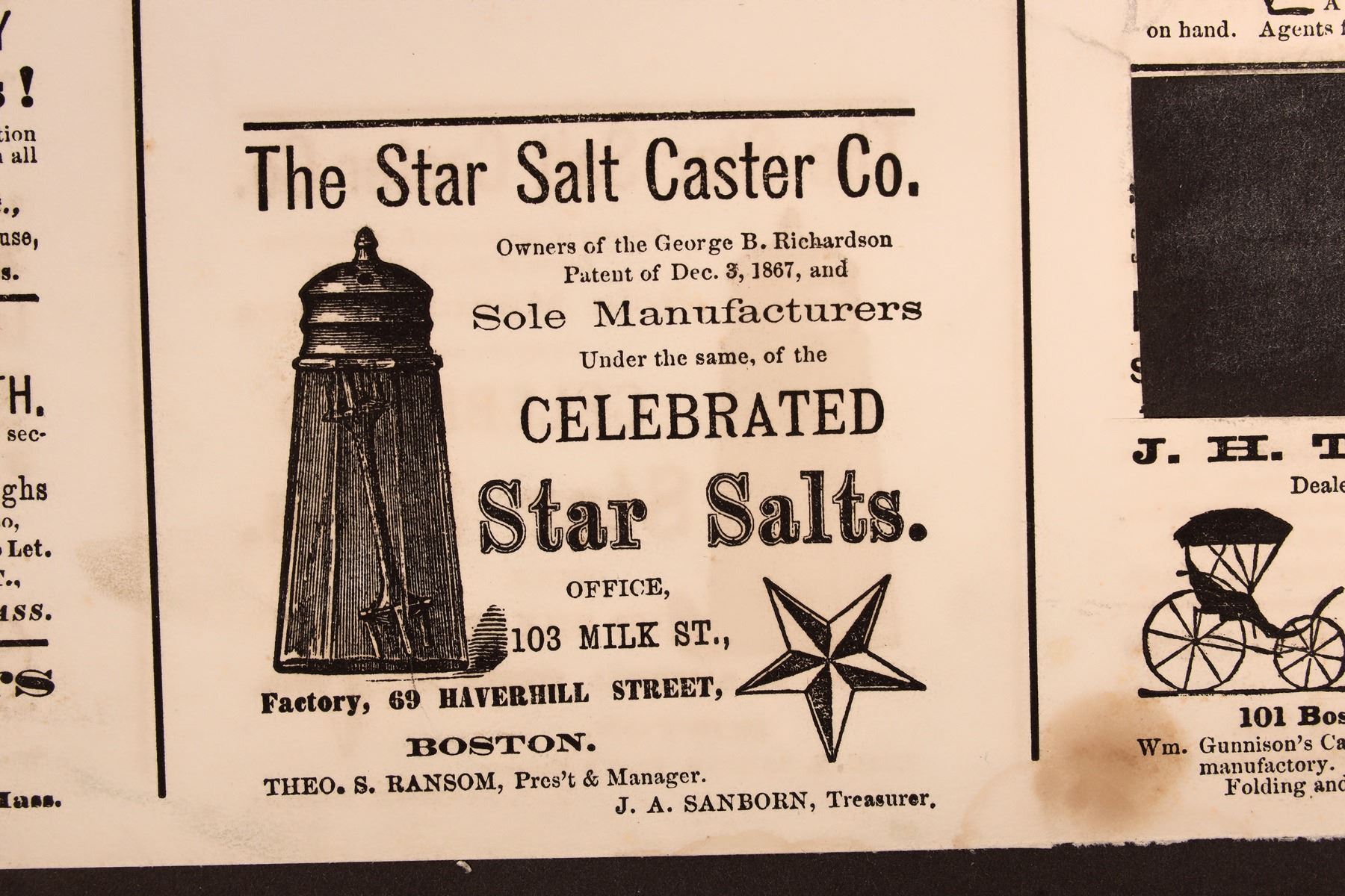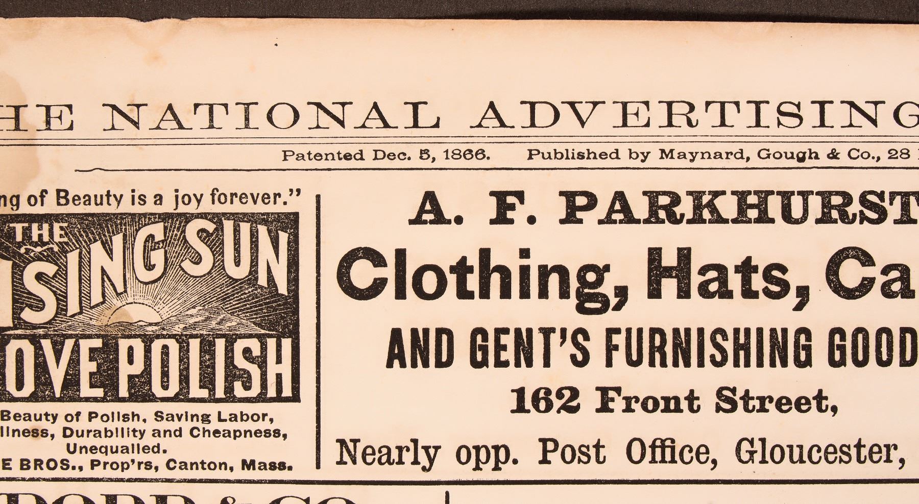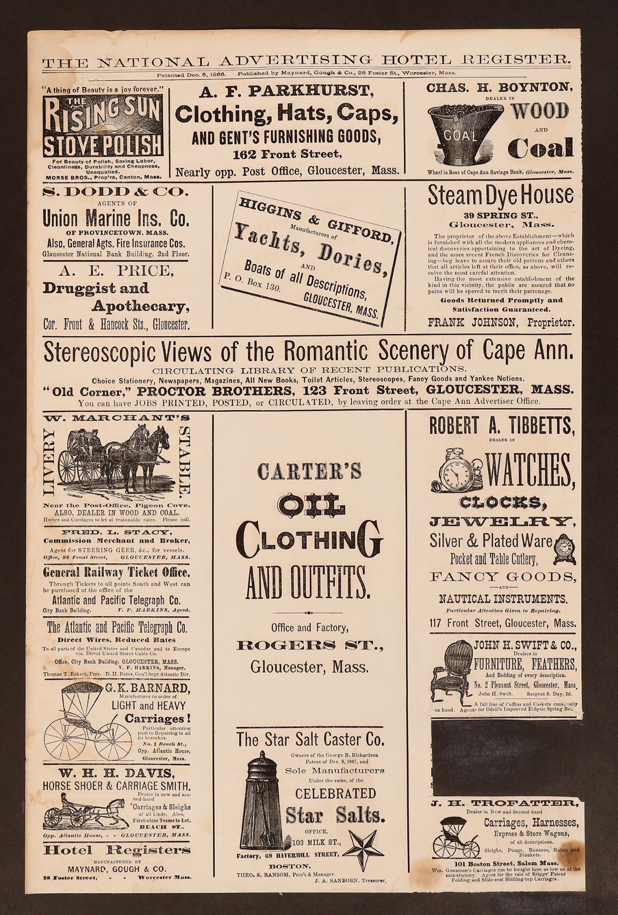 This is titled The National Advertising Hotel Register. It's dated December 6, 1866 & has ads for everything from light & heavy carriages to watches, salt & Carter's Oil Clothing. It measures 10"x 15.5" & is in decent condition. Please see photos for more details.[ Gloucester Massachusetts