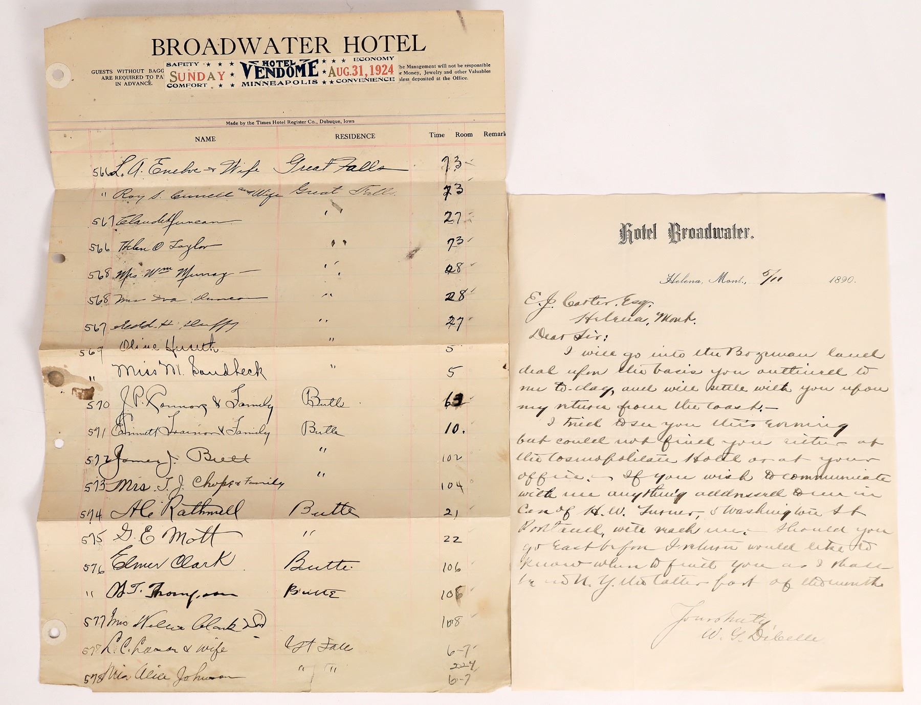 Hotel Broadwater 1890 letterhead and 1924 original ledger page.