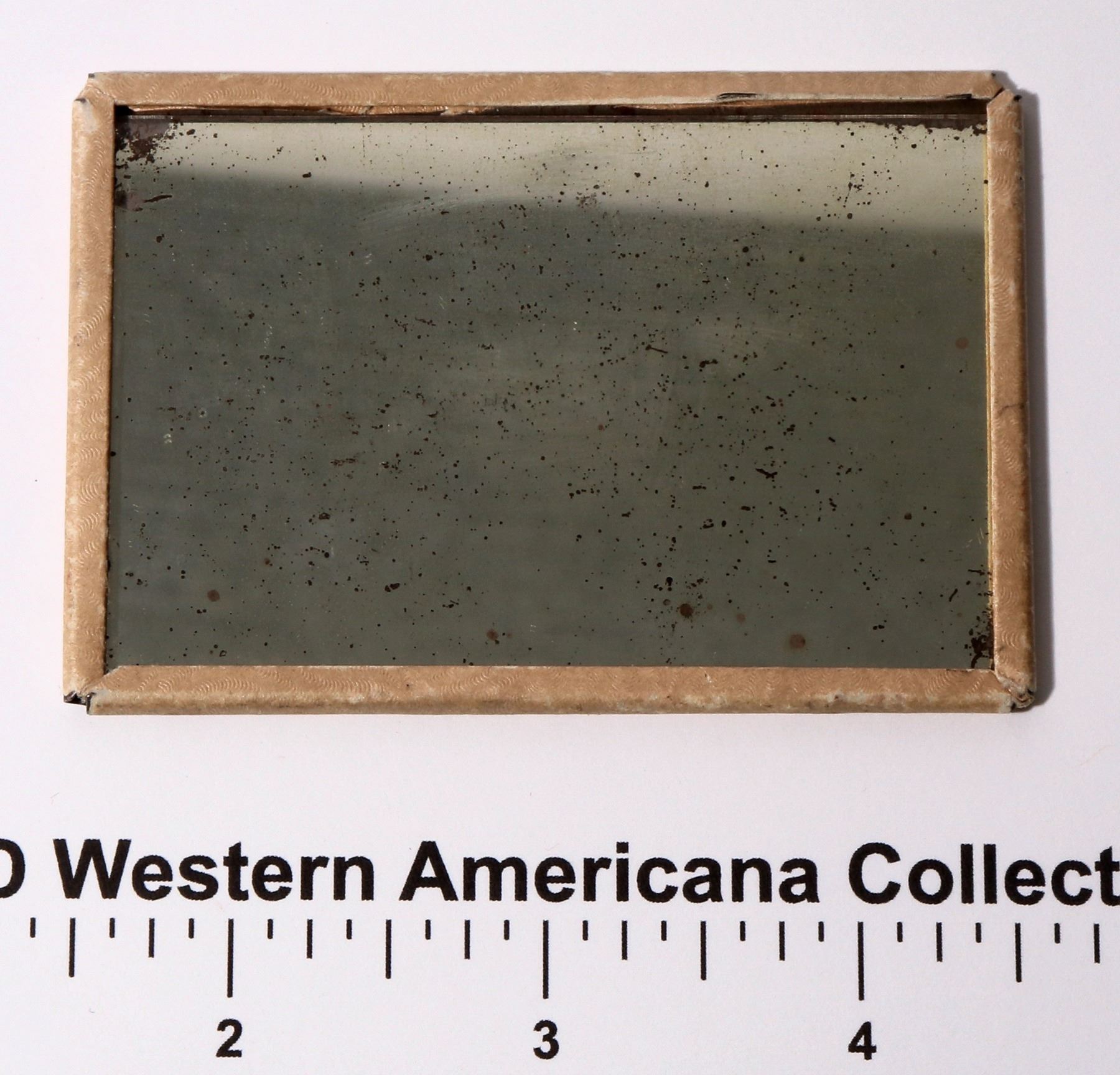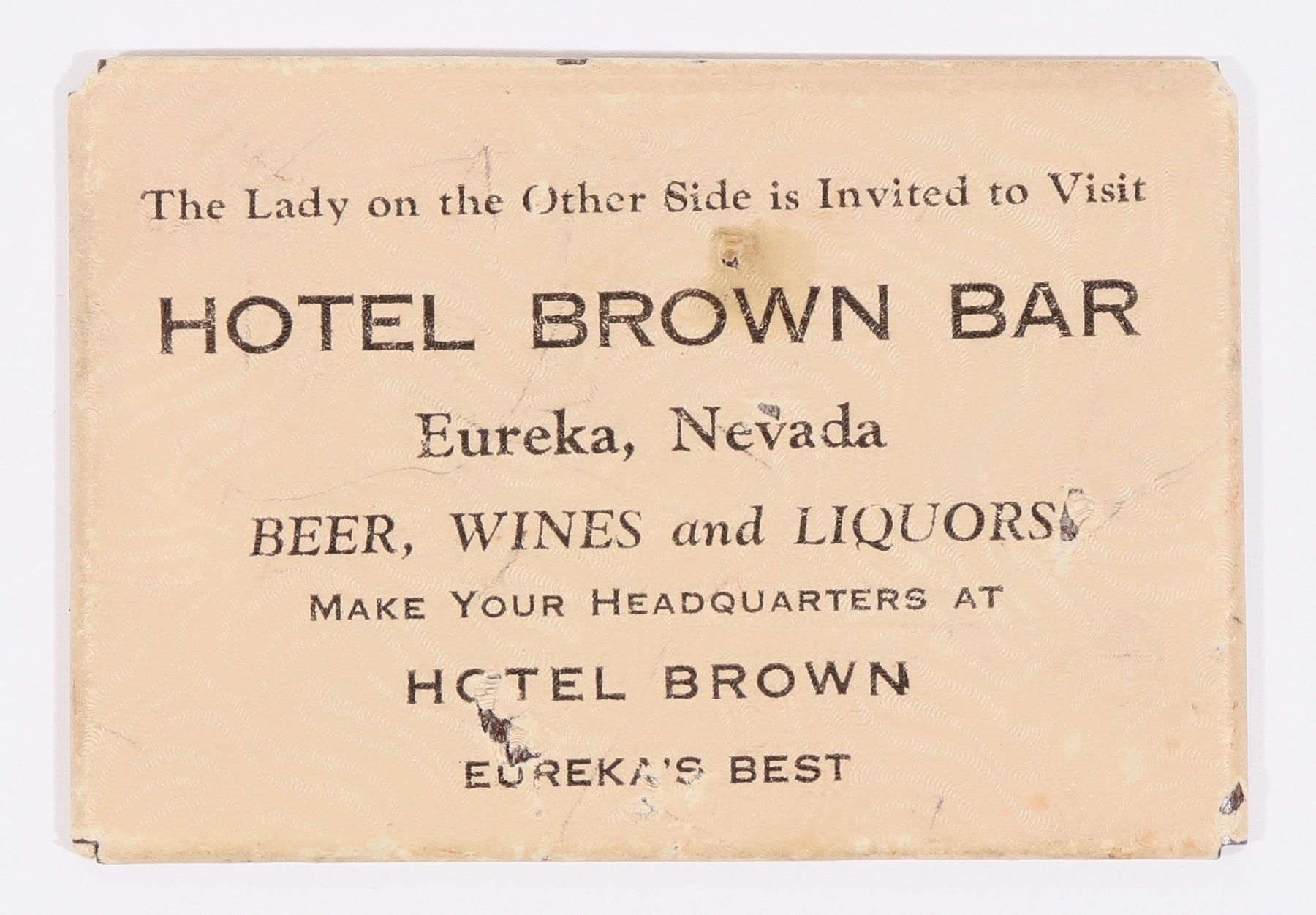 Extra rare advertising mirror, Hotel Brown Bar reads "The Lady on the Other Side is Invited to Visit Hotel Brown Bar, Eureka, Nevada/ Beer, Wines and Liquors... " 3 x 2". Nevada Eureka