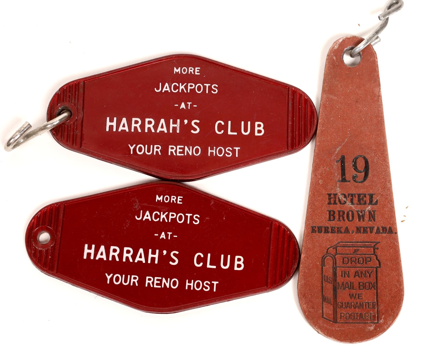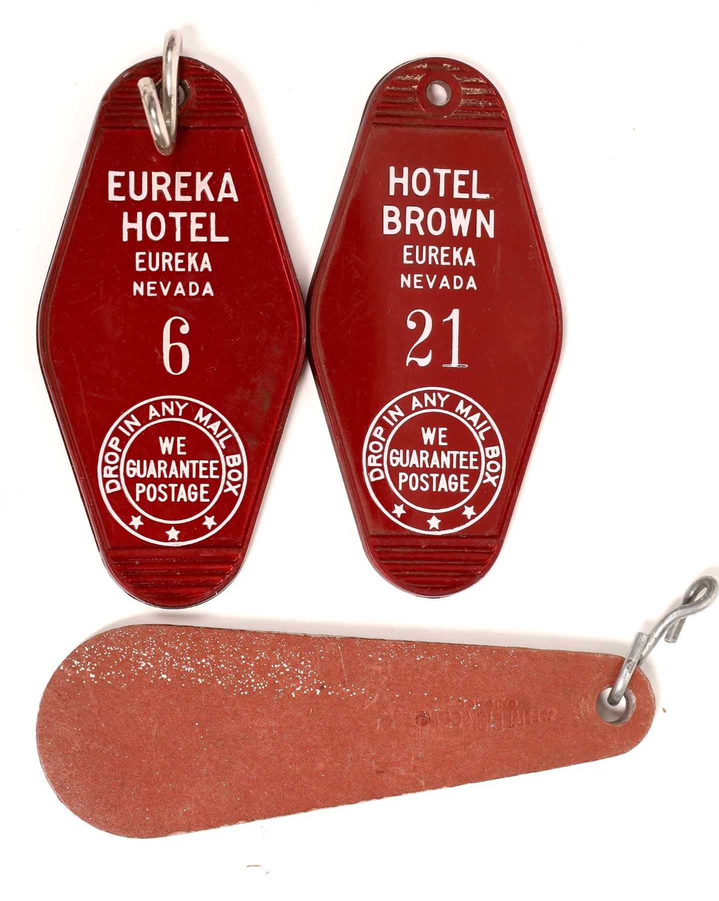 Hotel Brown was featured on Ghost Hunter tv program on the Travel Channel as a haunted hotel.Built in 1877 as the famous Jackson House it was gutted in the 1880 fire and rebuilt. Once advertised as the only fire-proof hotel in Nevada, in 1907 its name changed to Brown Hotel. In 1981 the building was restored and once again called the Jackson House. It now operates as bar, restaurant and hotel. Included with this lot is one brown leather key fob and two red plastic key fobs.