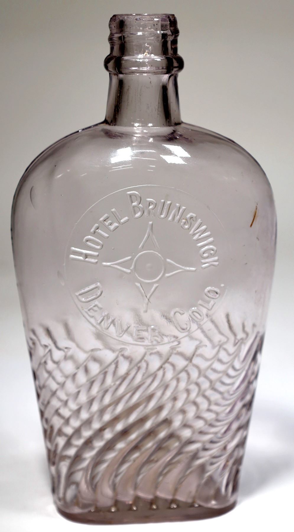 Preble W-30. Hotel Brunswick / (star pictorial) / Denver, Colo. Very faint purple glass, ground top, 7.5". Wavy raised pattern on bottom half. Bubbles, small raised bump on reverse, adhesive label on reverse. Please inspect.