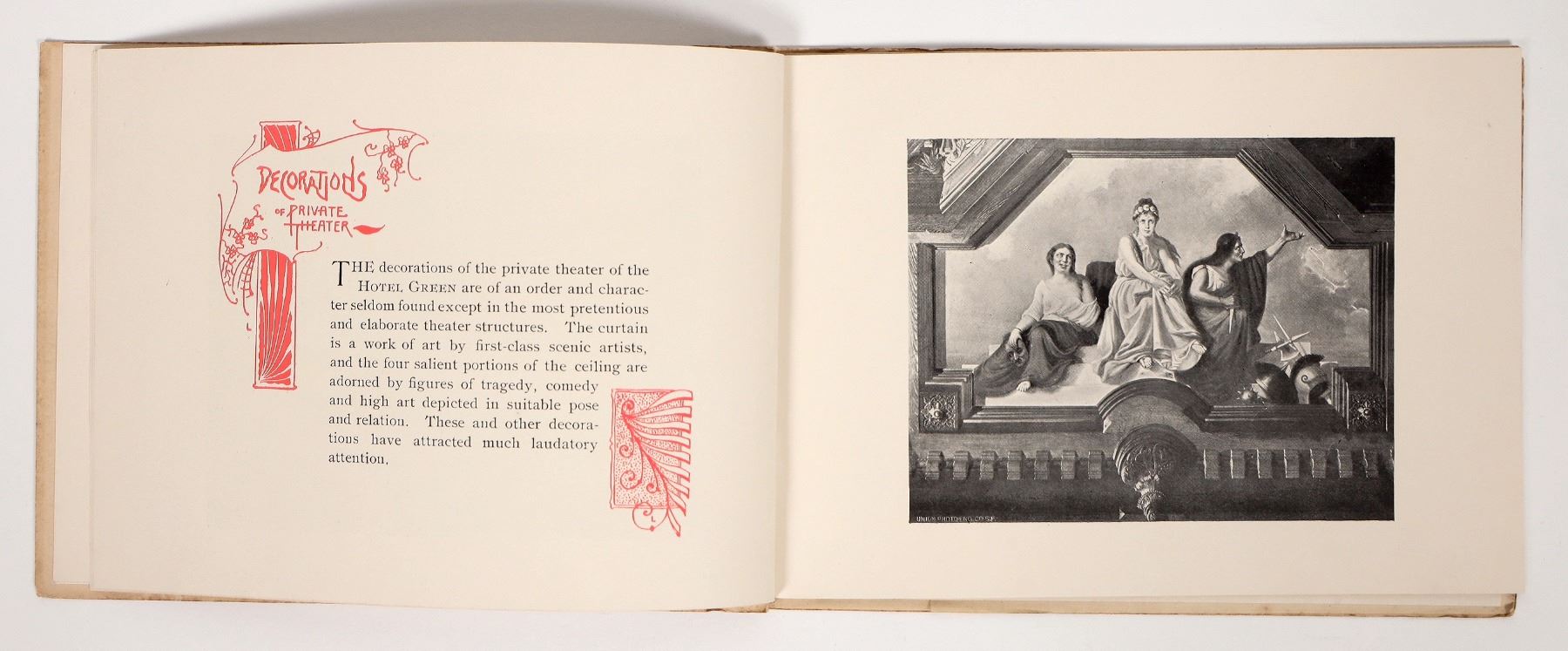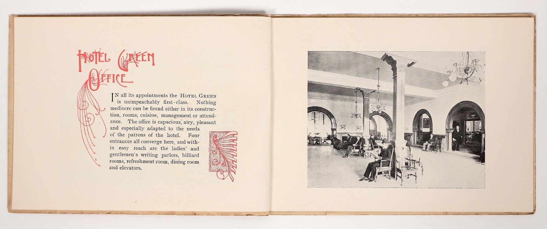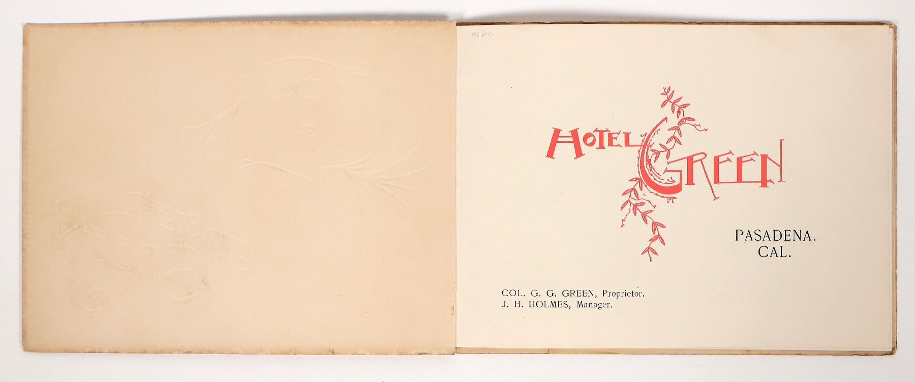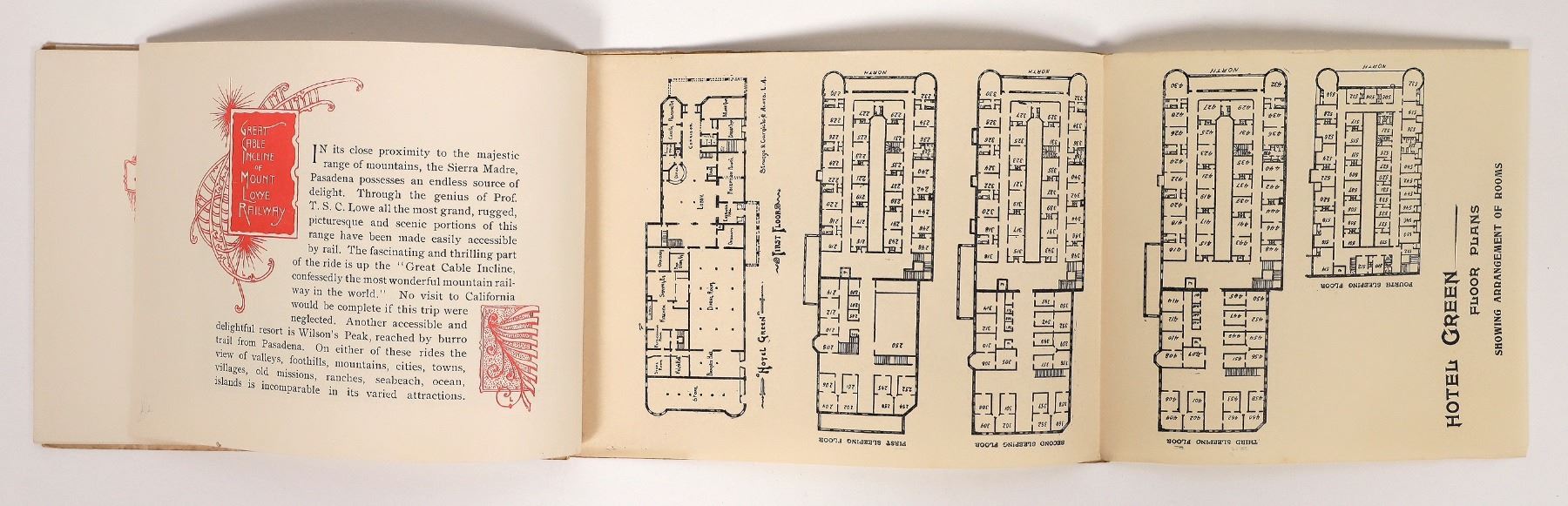 Hotel Green promo booklet with folding floor plan map in the back, 5 x 7", published by Kingsbury, Barnes & Nuener, Los Angeles. Colonel Green's famous hotel, still standing, now just two blocks from the worst fire in So. Cal. history. Generally mint. Holabird family collection.