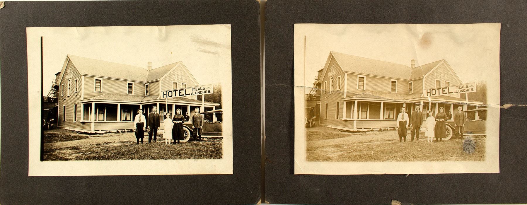 Hotel Montana photograph. Location is not known. Dated by car in photo. One photo is pristine and sharp. The other has a full length bend in it. Size 5 x 7". HWAC# 35600 Date: c1920's Location: Montana