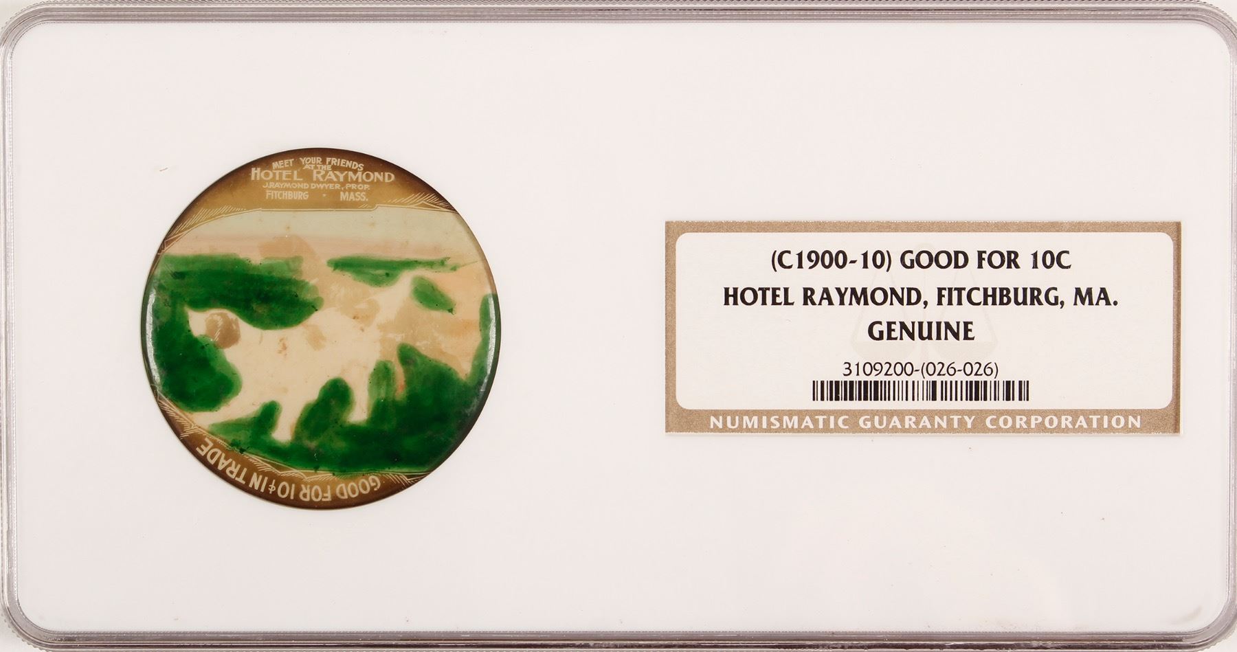 2.25" MEET YOUR FRIEND'S / AT THE / HOTEL RAYMOND / J. RAYMOND DWYER, PROP. / FITCHBURG . MASS / GF 10C IN TRADE Date: c. 1900-1910 Location: Fitchburg, Massachusetts HWAC# 54964