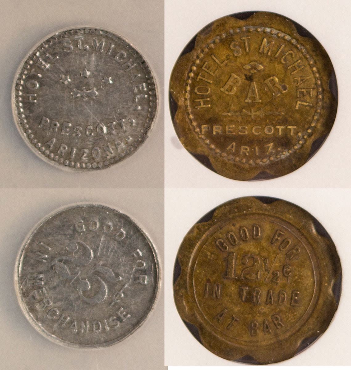 Lot of two: 1) Hotel St. Michael / Bar / Prescott / Ariz.; Rev. : Good For / 12 1/2c / In Trade / At Bar. Br., scalloped, NGC AU 50. 2) Obv.: Hotel St. Michael / Prescott / Arizona; Rev.: Good For / 25c / In Merchandisse. Al, rd., 24 mm. NCS certified Genuine. State: Arizona City: Prescott Date: ID# 79010