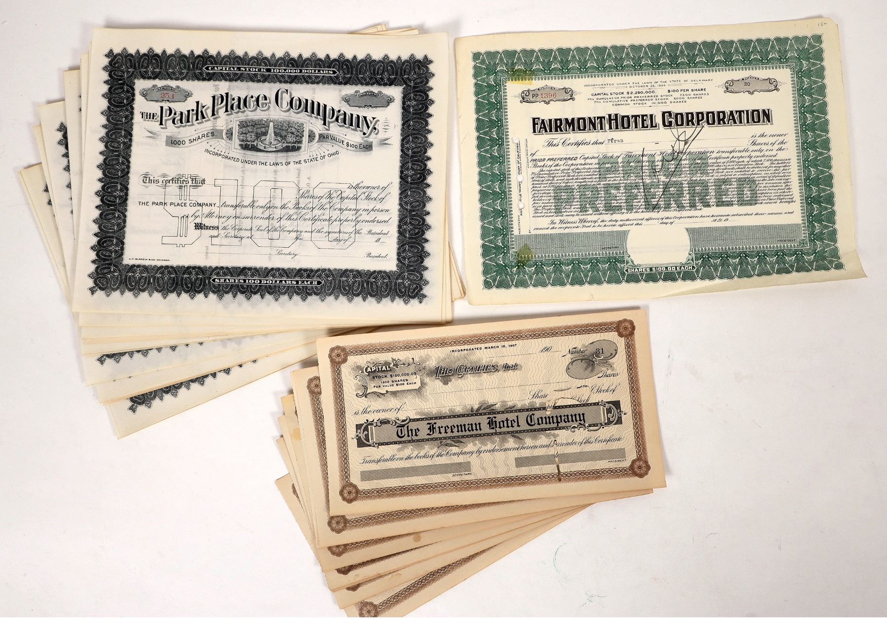 Unissued stocks-1x Fairmont Hotel, 14x Freeman Hotel, 18x Park Place Co.