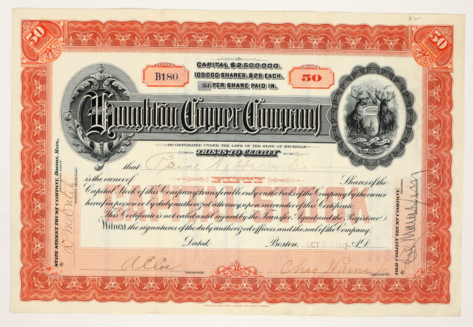 Inc. in Michigan. No. B180, issued for 50 shares to Paine, Webber & Co. in 1912. Signed by president Charles Paine Jr. and treasurer A. Coe. Not cancelled. Red/orange border, black print. 7.5 x 11" DeGood pgs. 165-167. R-7, one known. Property was 160 acres two miles south of Houghton. Produced 540,052 lbs. of copper.