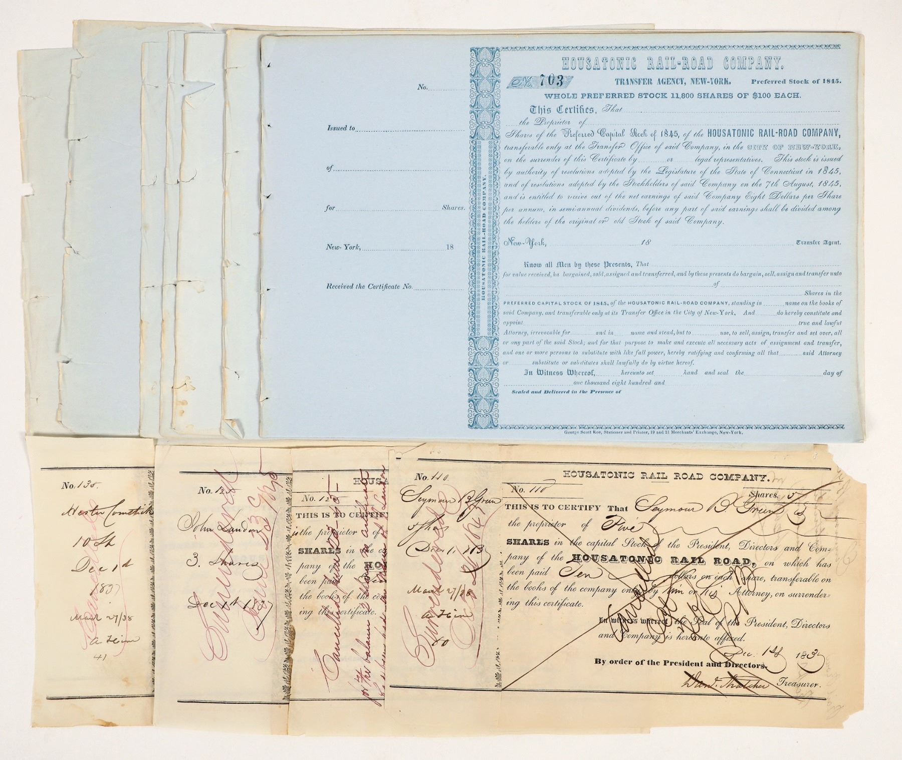 Four issued (1830s) and sixteen unissued (1845) stock certificates from the Housatonic Rail Road Company.