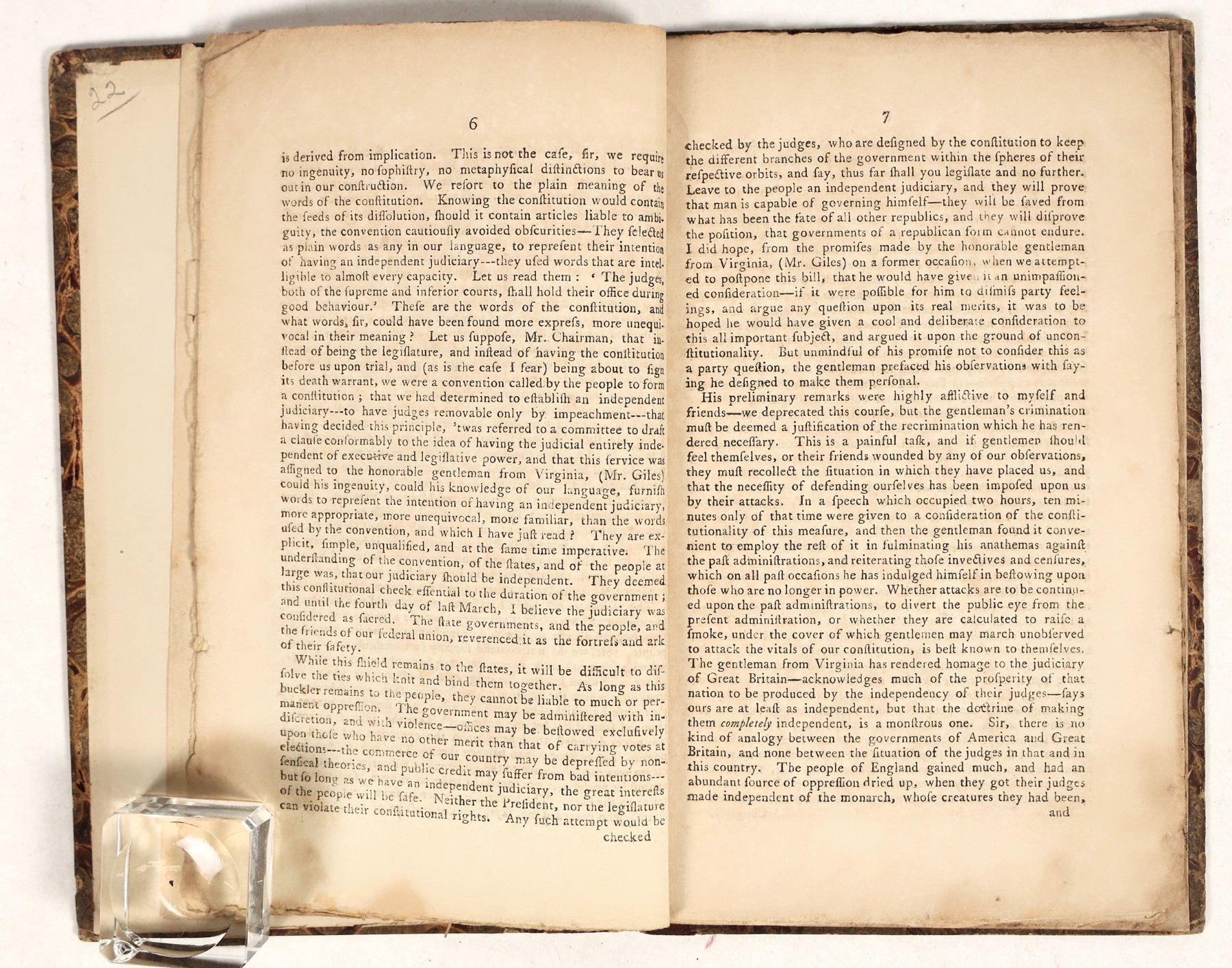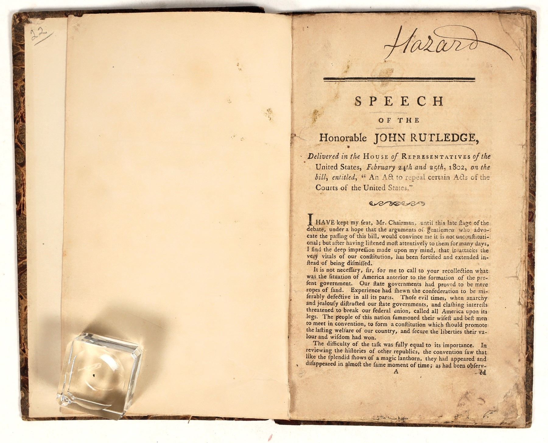 Joh Rutledge was speaking regarding a bill about the independence of the federal courts. He cited works of Jefferson, , Hamilton, Madison. This regarding the Independence of the judiciary and judges to be removed only by impeachment.