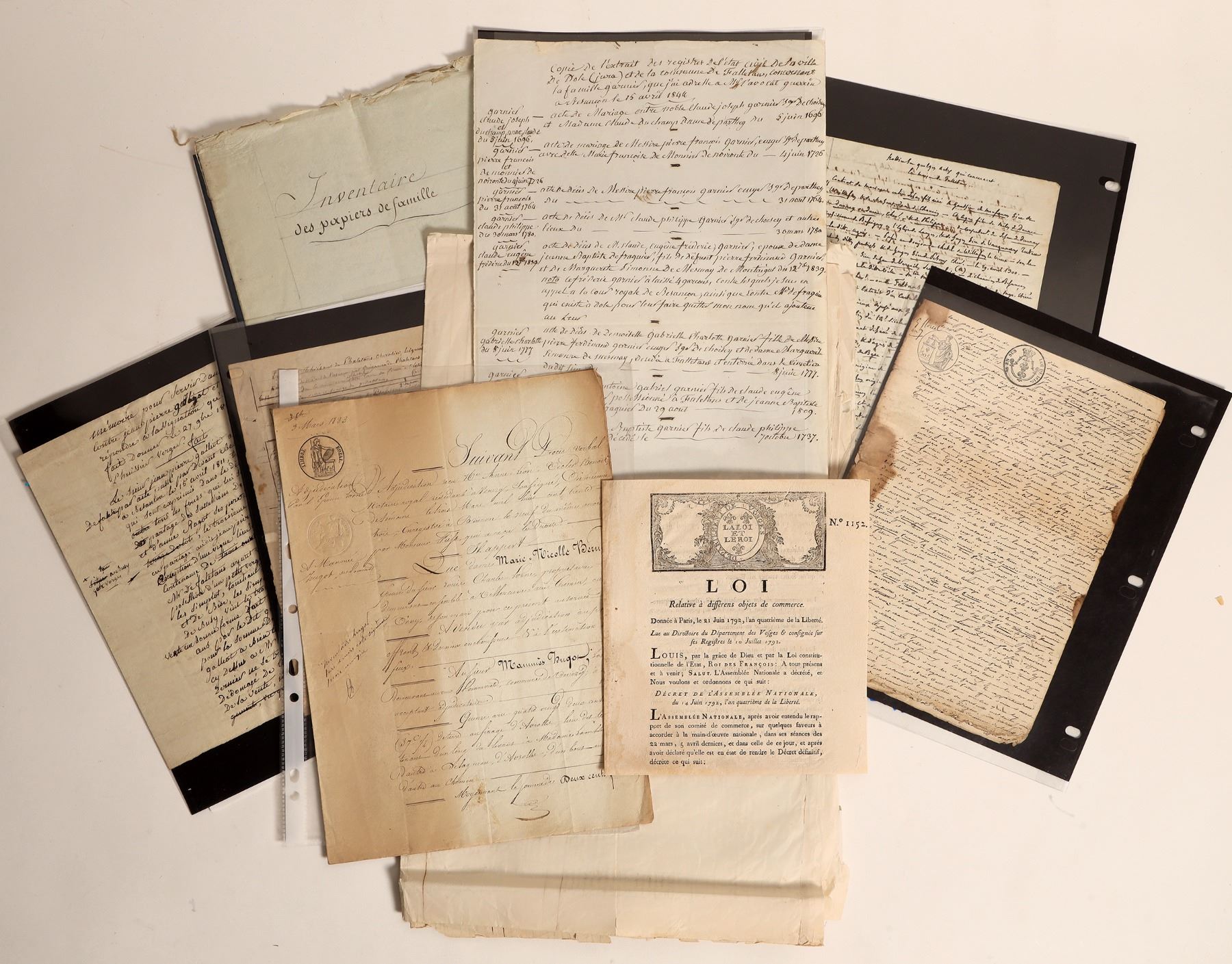 Documents and letters from the French aristocratic Falletan Family (6). This includes a nine page inventory of important papers on watermarked paper. There are other handwritten documents from one of the oldest families in the province of Franche-Comte. They vary in condition. Please see photos for more details.