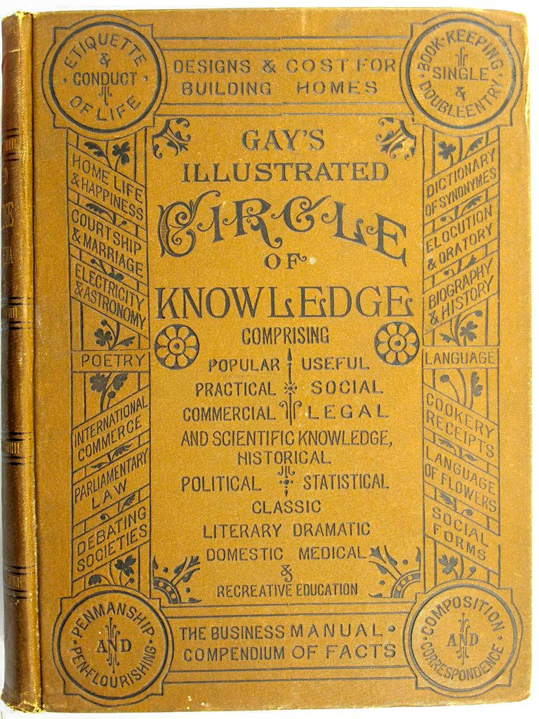 A Household Library of Scientific and Useful Knowledge, prepared by Wright, Dexter et al. Hardcover, 756 pages including many illustrations and full color "Presented To" page. Gay Brothers and Co., Publishers, New York, 1886. Book of knowledge "comprising popular, useful, practical, social, commercial, legal, and scientific knowledge; historical, political, statistical, classis, literary, dramatic, domestic, medical, and recreative education."