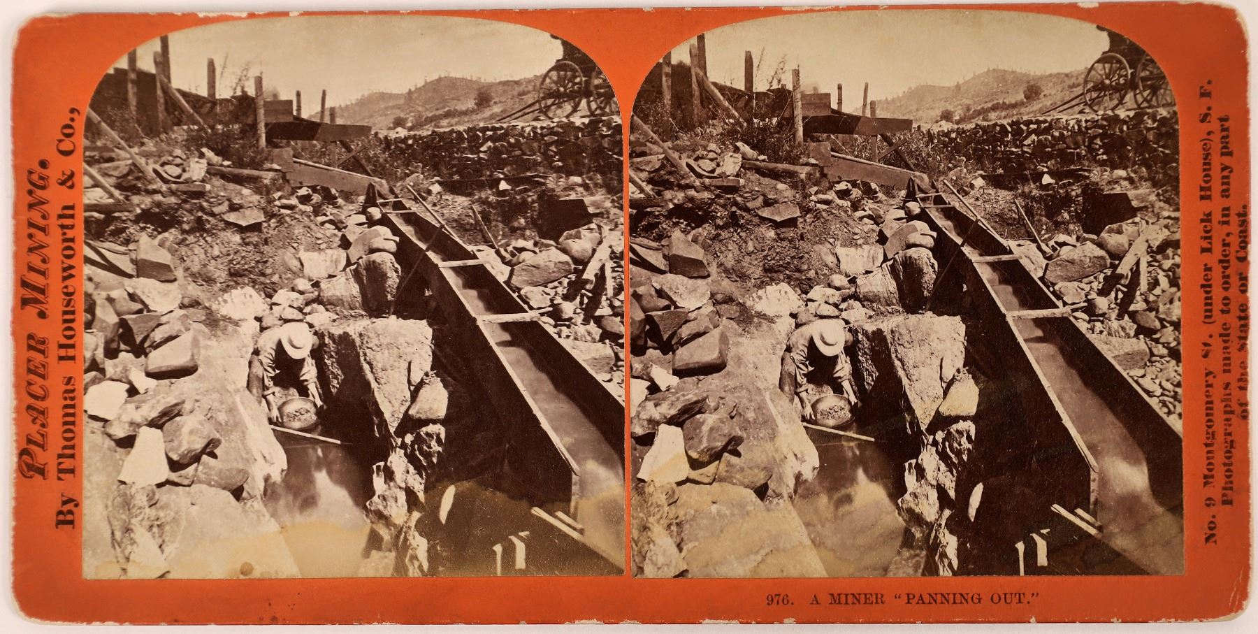 The long tom is a small sluice that uses less water than a regular sluice. It consists of a sloping trough 12 feet long, 15 to 20 inches wide at the upper end, flaring to 24 to 30 inches at the lower end. This also shows a miner sampling the box by panning. Notice the hand constructed stone road in the rear with a wagon. California Franklin Collection
