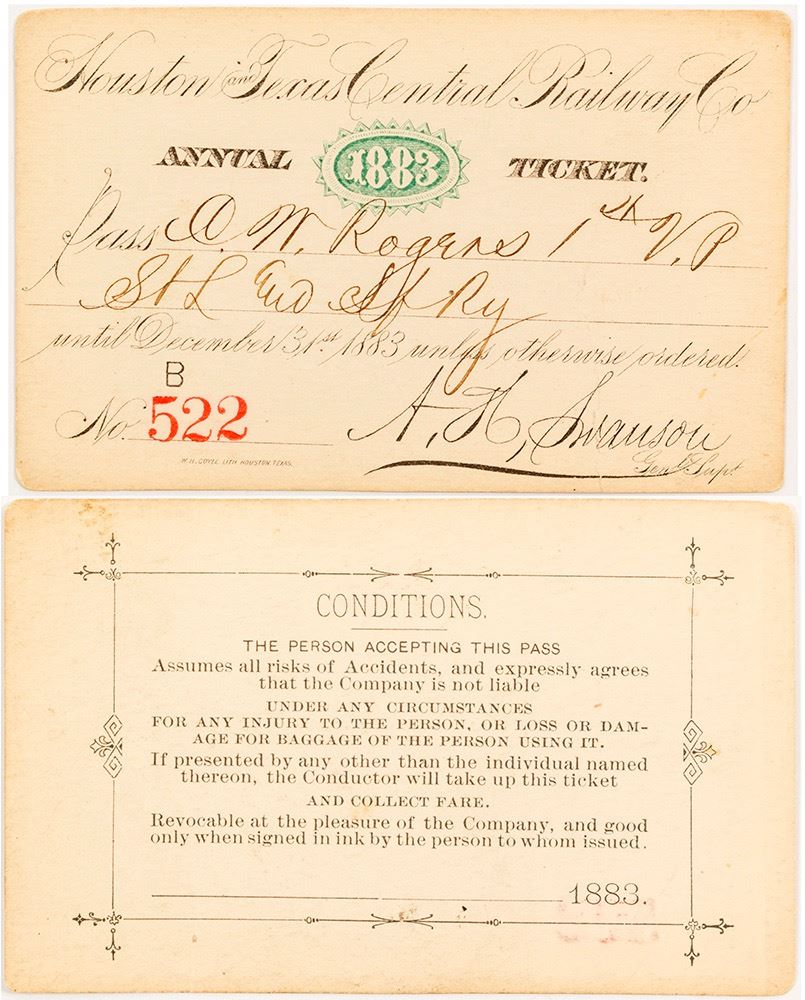 Number 522. This railroad was incorporated in 1875 by the state of Texas in a special act. They would merge into the Houston & Texas Central Railroad in 1889. Signed by AB Swanson. For CW Rogers, 1st Vice President of the St. L. and S.. Slight discoloration at the top and a Small 1" bend in the bottom right. Date: Location: Texas HWAC # 53526