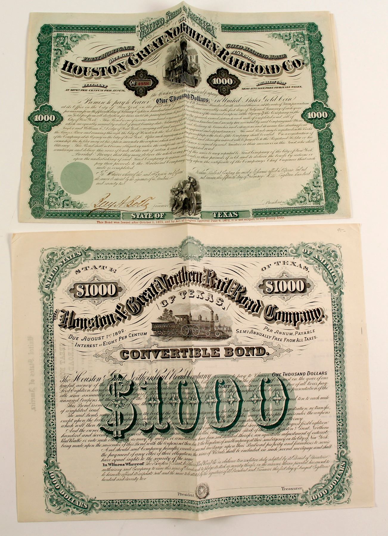 2 bonds: One $1000 gold bearer bond, green border, unissued, two vignettes: top of train l-r, bottom: men loading cart, all coupons attached, AU cond, Continental Bank Note Co printer. One $1000 Convertible Bond, unissued, "$1000" underprint, vignette top locomotive l-r and bottom wreath w/star, AU cond, W.H. Arthur & co printer.