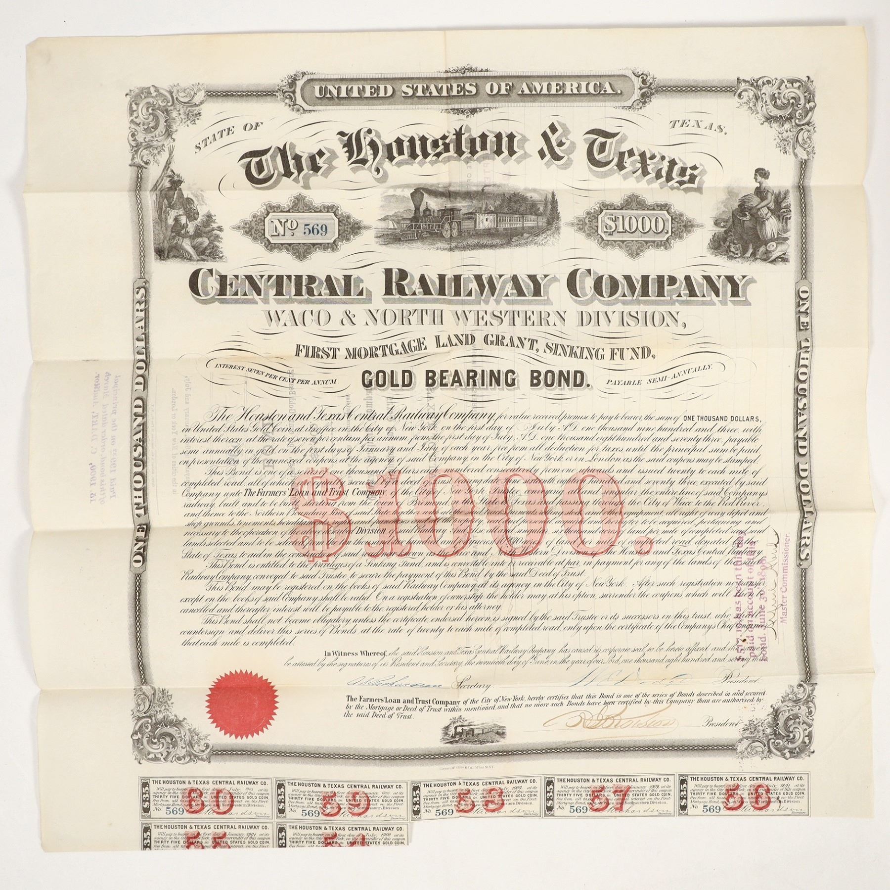 $1000 Gold Bearing bond from the Houston and Texas Central Railway Company issued 1903. Railroad and native vignettes.