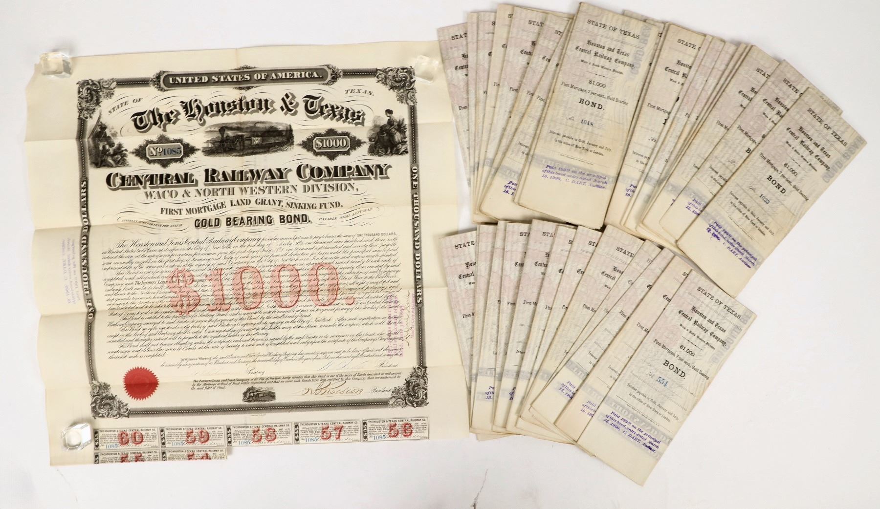 First Mortgage, 7 per cent, Gold Bearing bonds (38) issued by the Houston and Texas Central Railway Company in 1873, paid in 1900. Three vignettes on each.