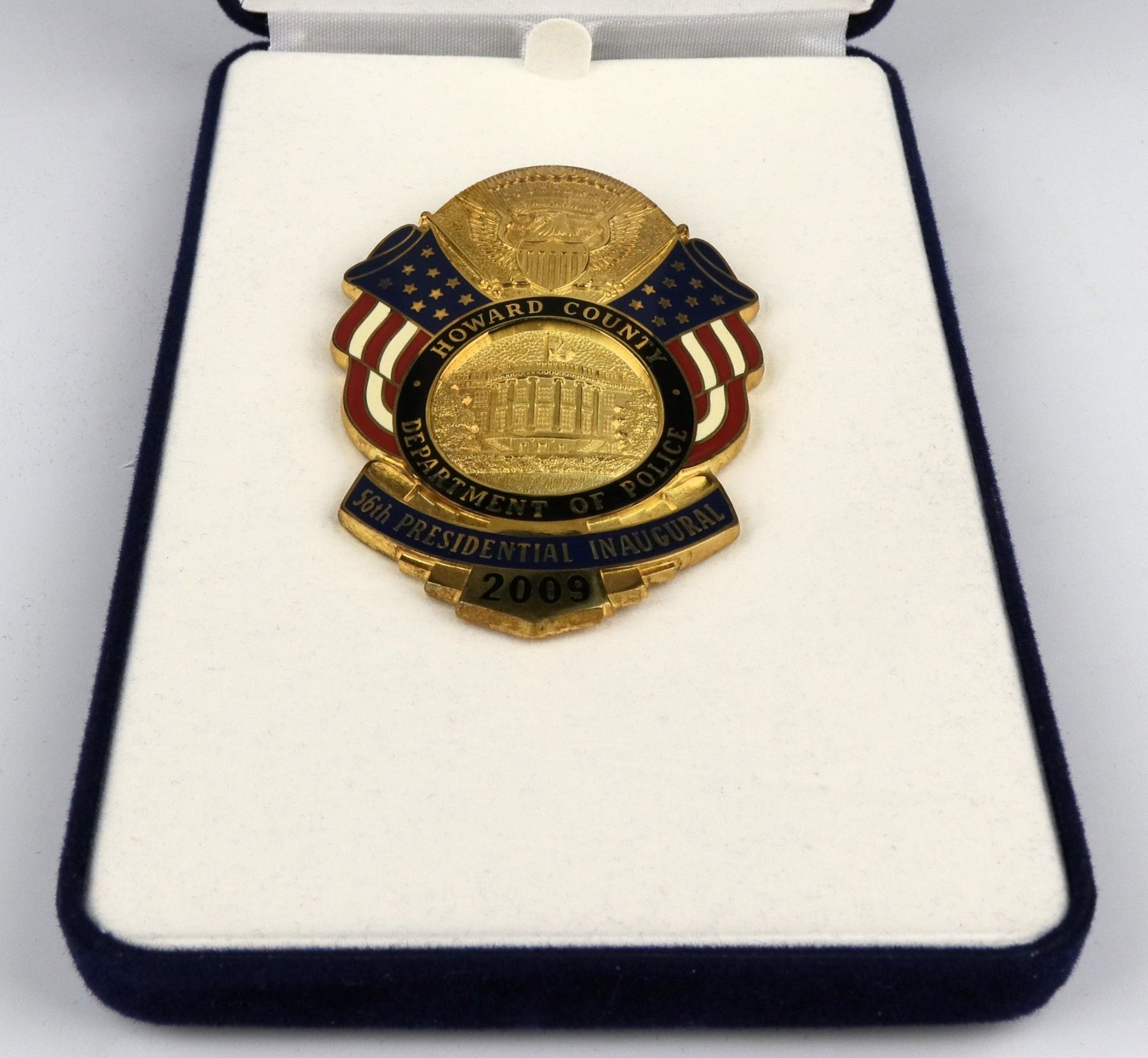 Made by Collinson brass w/gold plate #210, Howard County Dept. of Police. 2009, 58th Presidential, inaugural. Pres. Seal top , Stars & Stripes on sides. White House center. Brushed back. In Velvet presentation case, with a certificate from Collinson C0. Item is sold as a historical/collectible only. It does not convey, nor should it be used as an authority of any kind. Sale of this item is in full compliance with the United States Federal Law : 18 USC ss716. Impersonation of a police officer is a felony in most jurisdictions and subject to arrest.