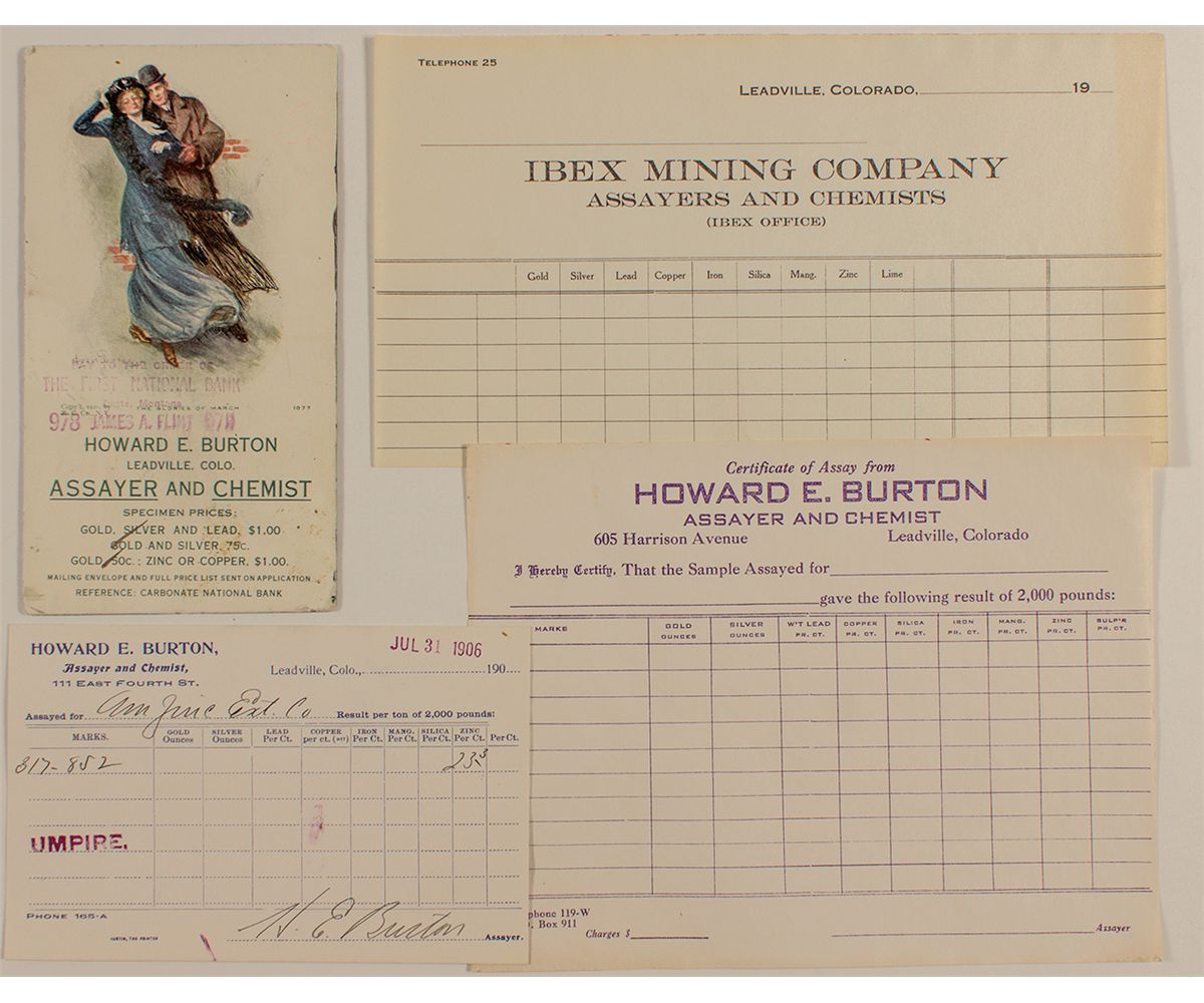 c. 1906-1910. Lot of 4. 1) Color ink blotter. Vignette of well-dressed man and woman dancing. Purple stamp from First National Bank of Butte, Montana. Light soiling and two pen marks. Reverse covered in ink stains (obviously). Measures 3 ¼" x 9" 2) 1906. Small assay receipt printed on thicker paper. Datelined Leadville, Colo., Jul 31 1906. Assayed for Am. Zinc Ext. Co. Stamped Umpire. The sample contained 23.3 per ct. zinc. Signed by H.E. Burton as assayer. Printed by Austin, The Printer. Measures 5 ½" x 3 ½" 3) Blank assayer voucher. Measures 18 ½ cm x 14 ½ cm. Light toning around edges. 4) 19__ Blank voucher for Ibex Mining Company, Assayers and Chemists. Measures 8 ½" x 4 ¾"City: LeadvilleCounty: LakeState: CODate:
