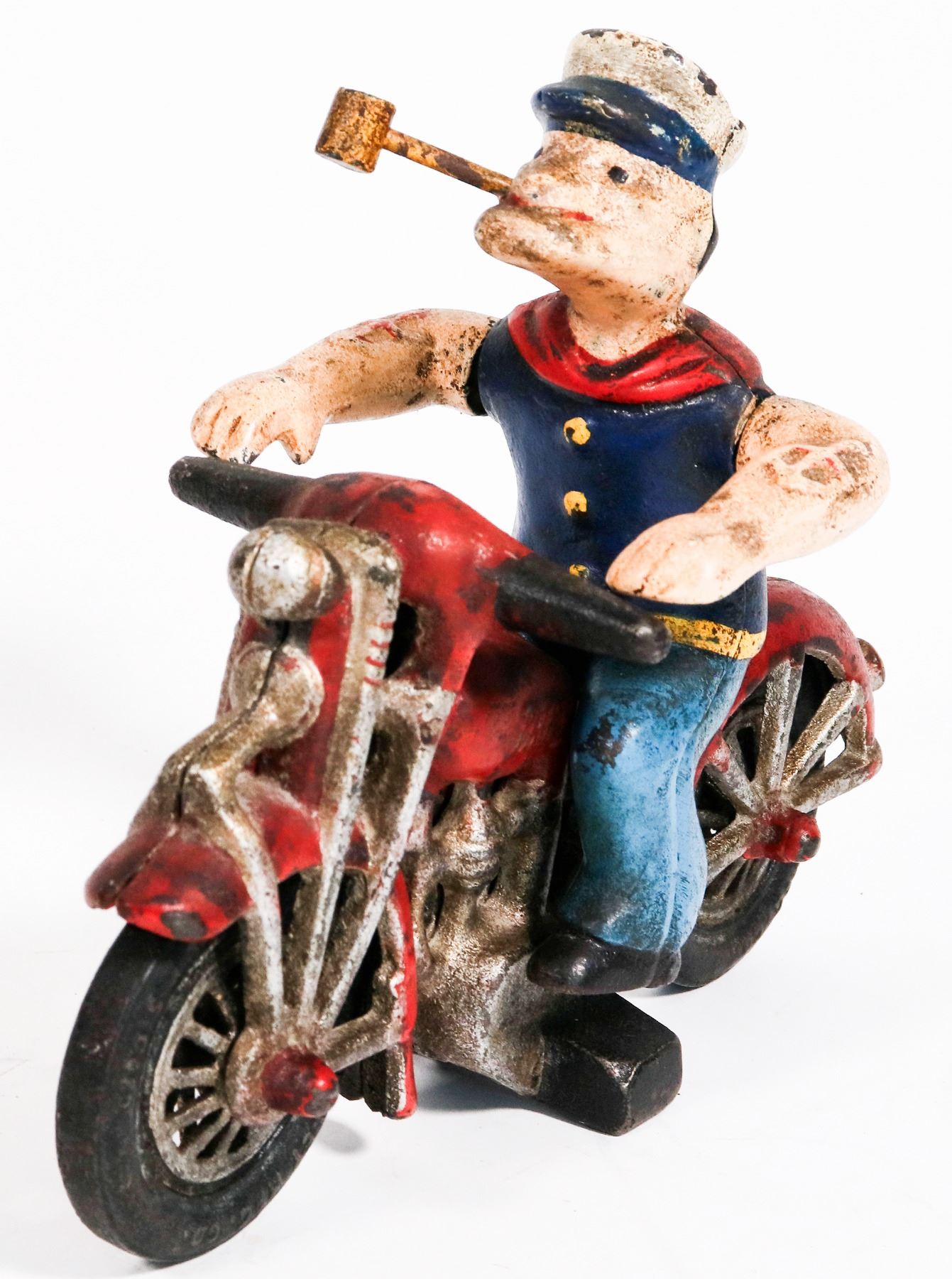 Hubley s Cast Iron Popeye Motocycle is complete and in overall good condition. Paint does show some slight wear. There is an old repair to right arms that is not visible, tires are in good condition. 1930s (A customer made the comment this might be a reproduction)