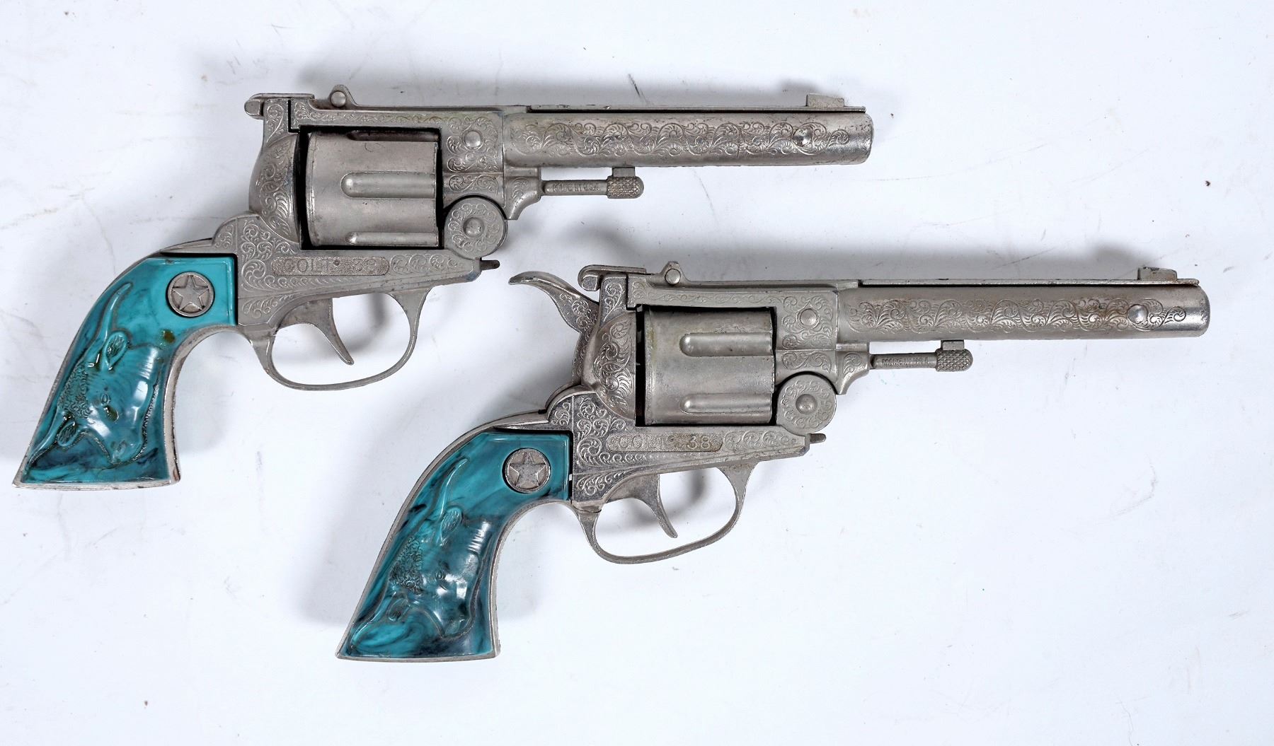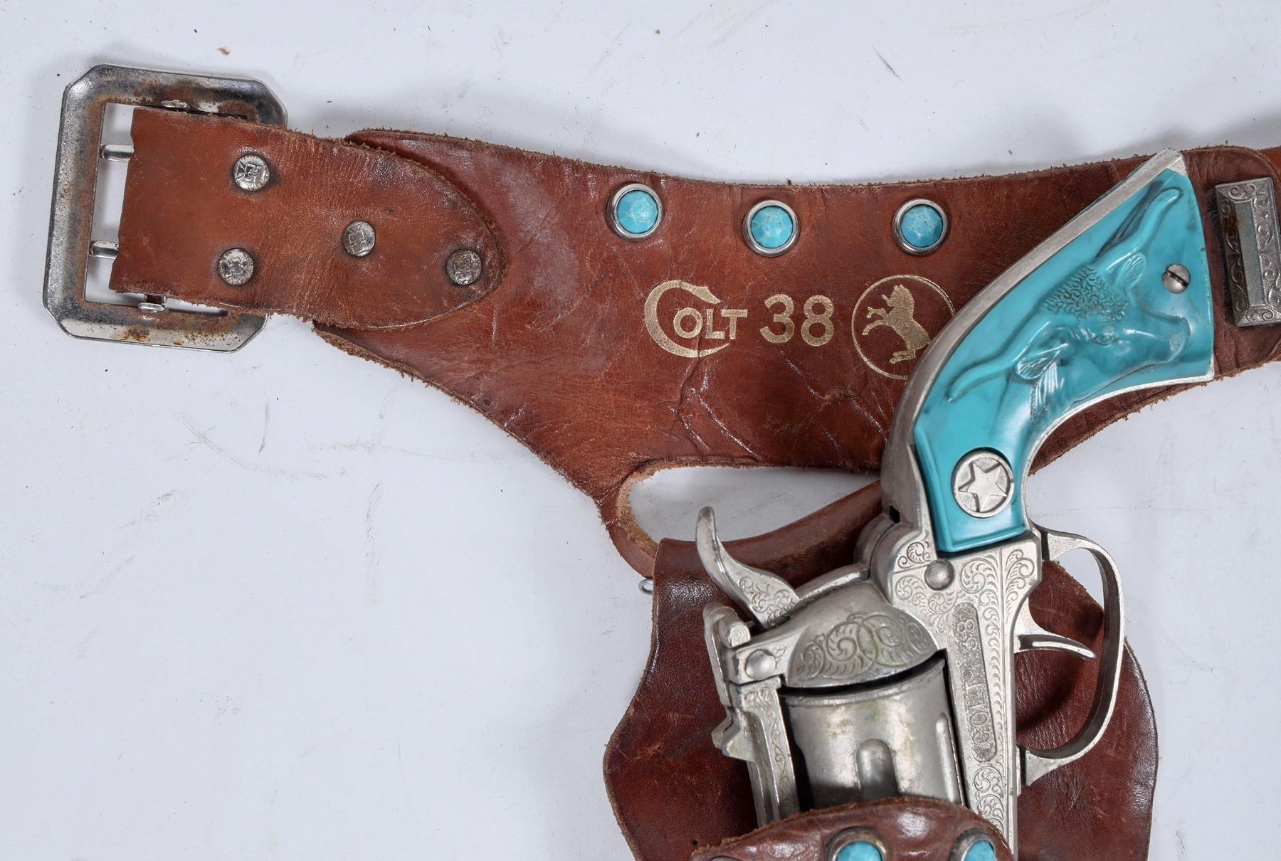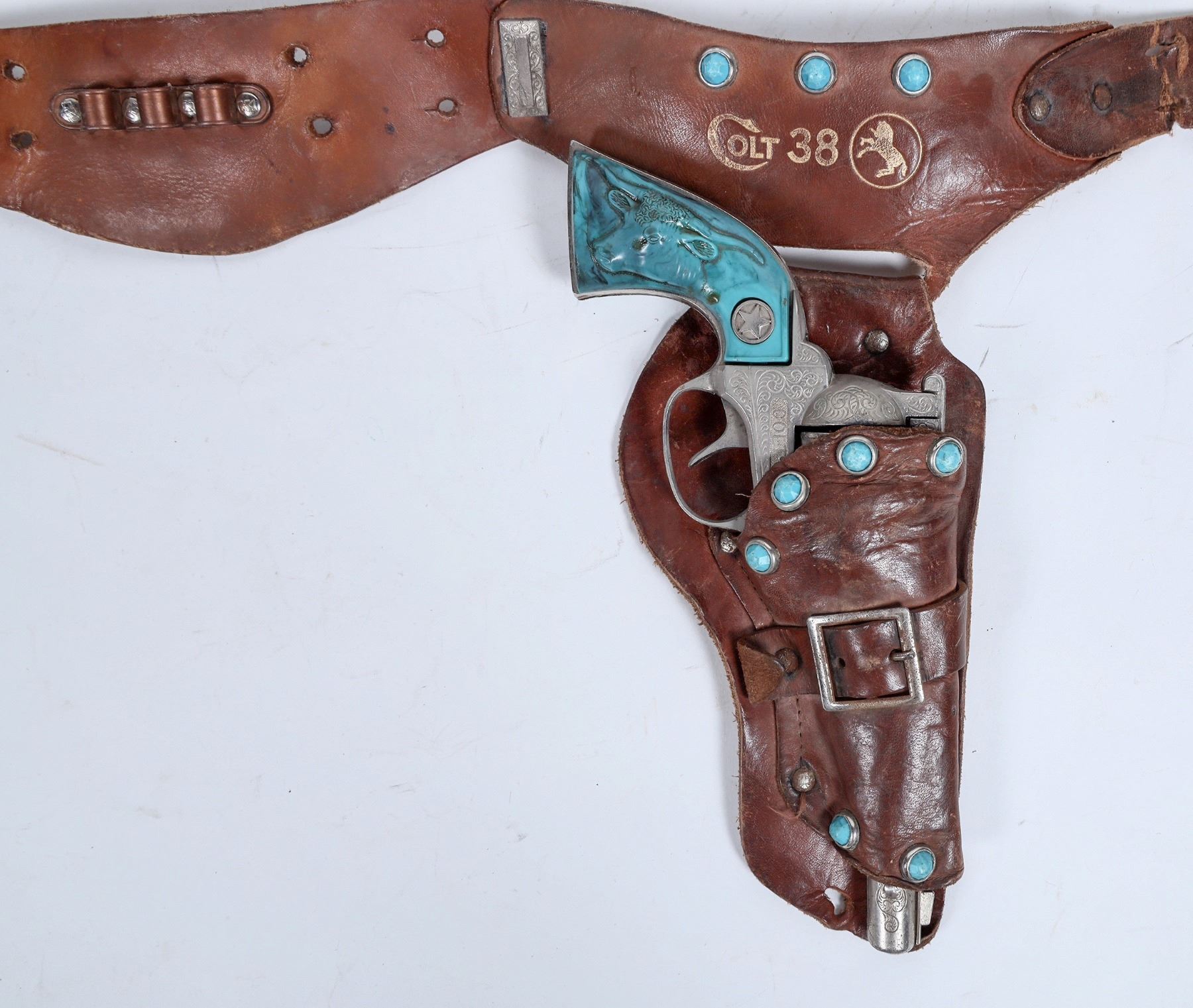 These cap pistols are marked Colt 38 with the rampant colt logos in top grain saddle leather holsters. One pistol is missing the hammer. Both guns have imitation turquoise grips with turquoise buttons all around the gun belt. C.1950s Hubley creations. The belt fits a small framed hombre. Please see photos for details.