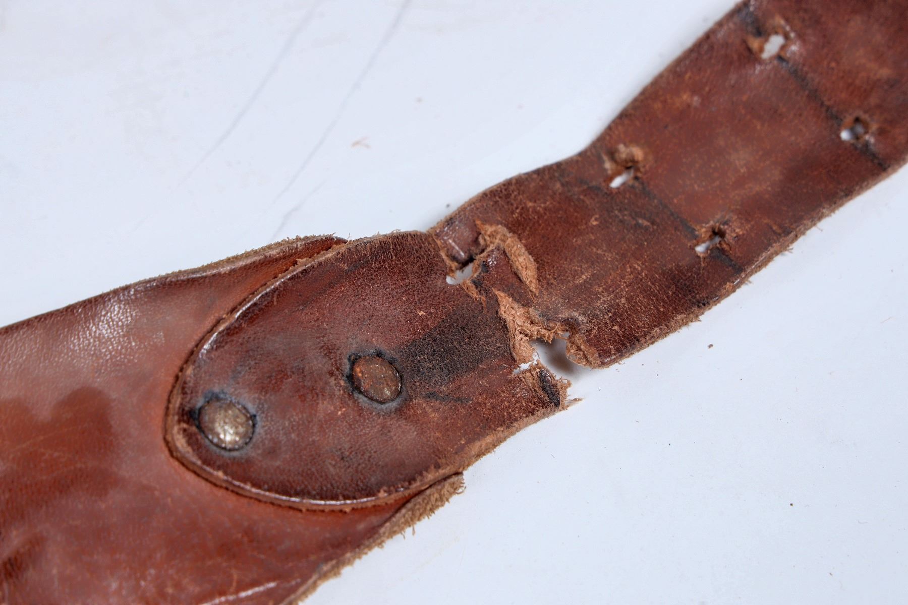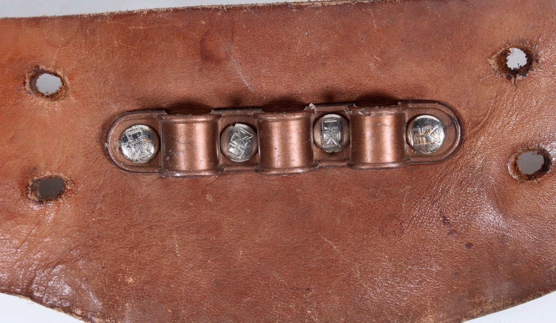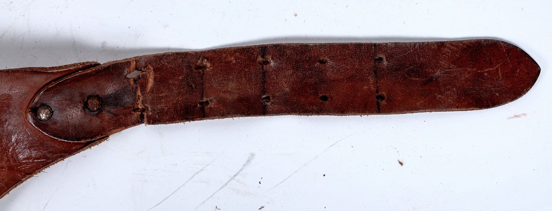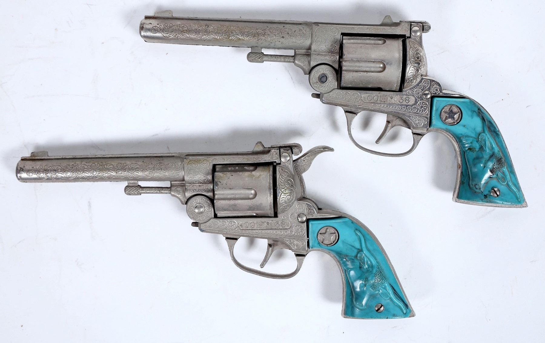 These cap pistols are marked Colt 38 with the rampant colt logos in top grain saddle leather holsters. One pistol is missing the hammer. Both guns have imitation turquoise grips with turquoise buttons all around the gun belt. C.1950s Hubley creations. The belt fits a small framed hombre. Please see photos for details.