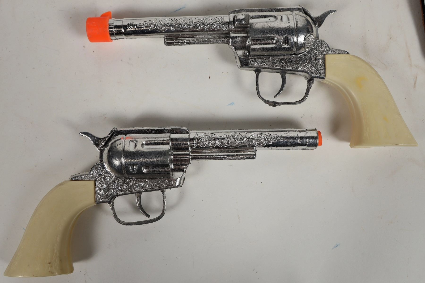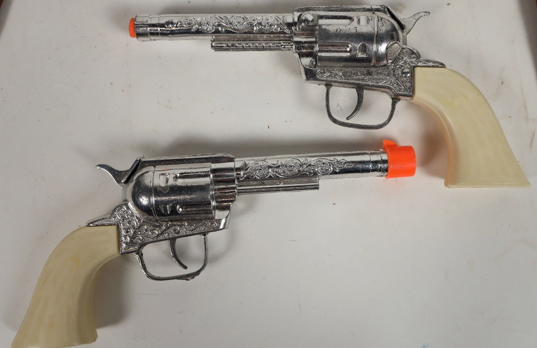 This is a Hubley "Pony Boy" cap pistol gun set with black leather holsters. In very good condition with both pistols working. The leather is in very good condition as well. Please see photo for details.