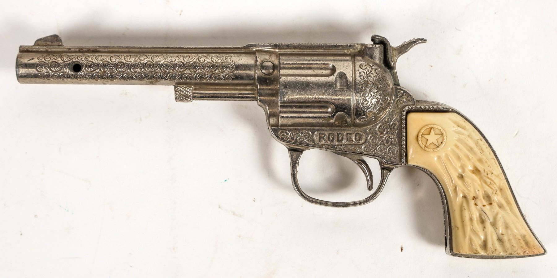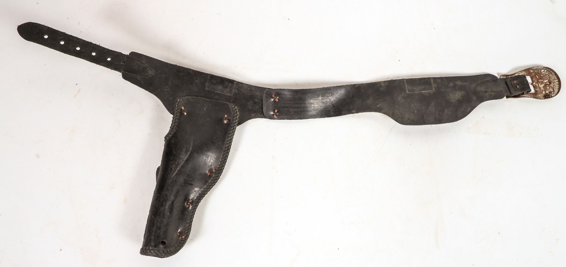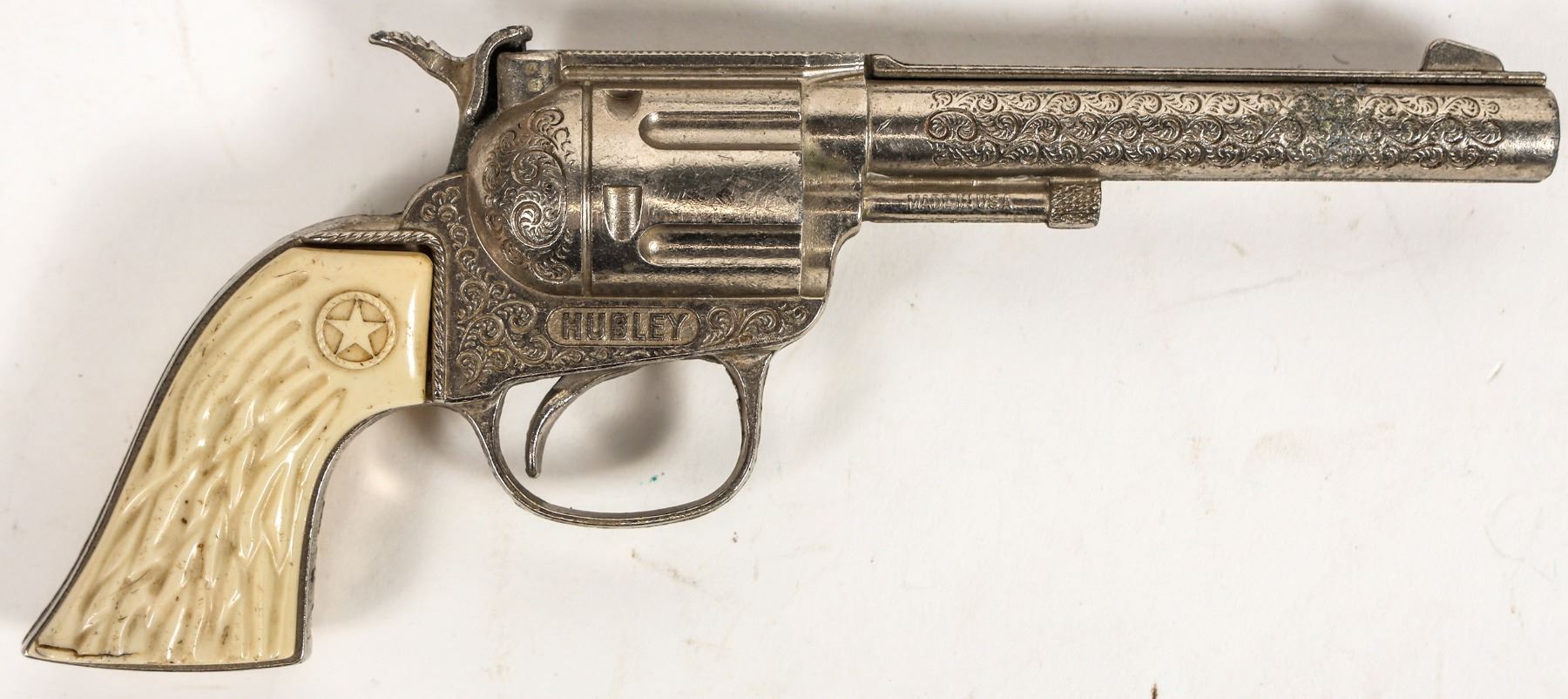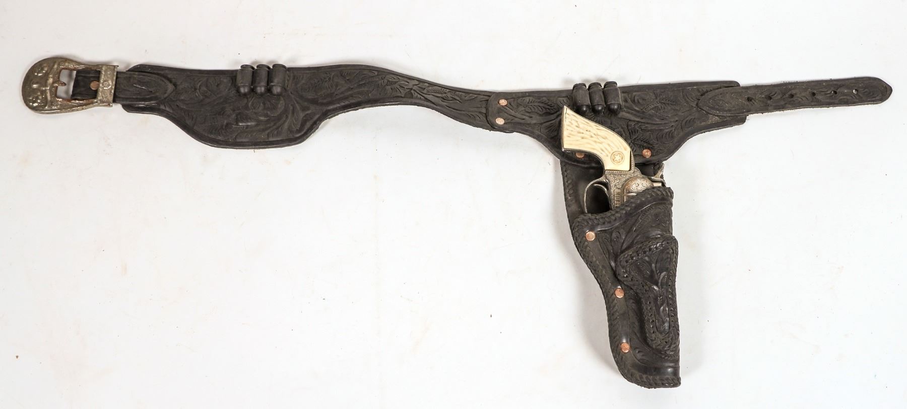 This is a single Hubley cap pistol in a black plastic holster and belt. The gun works poorly. Please see photo for details.