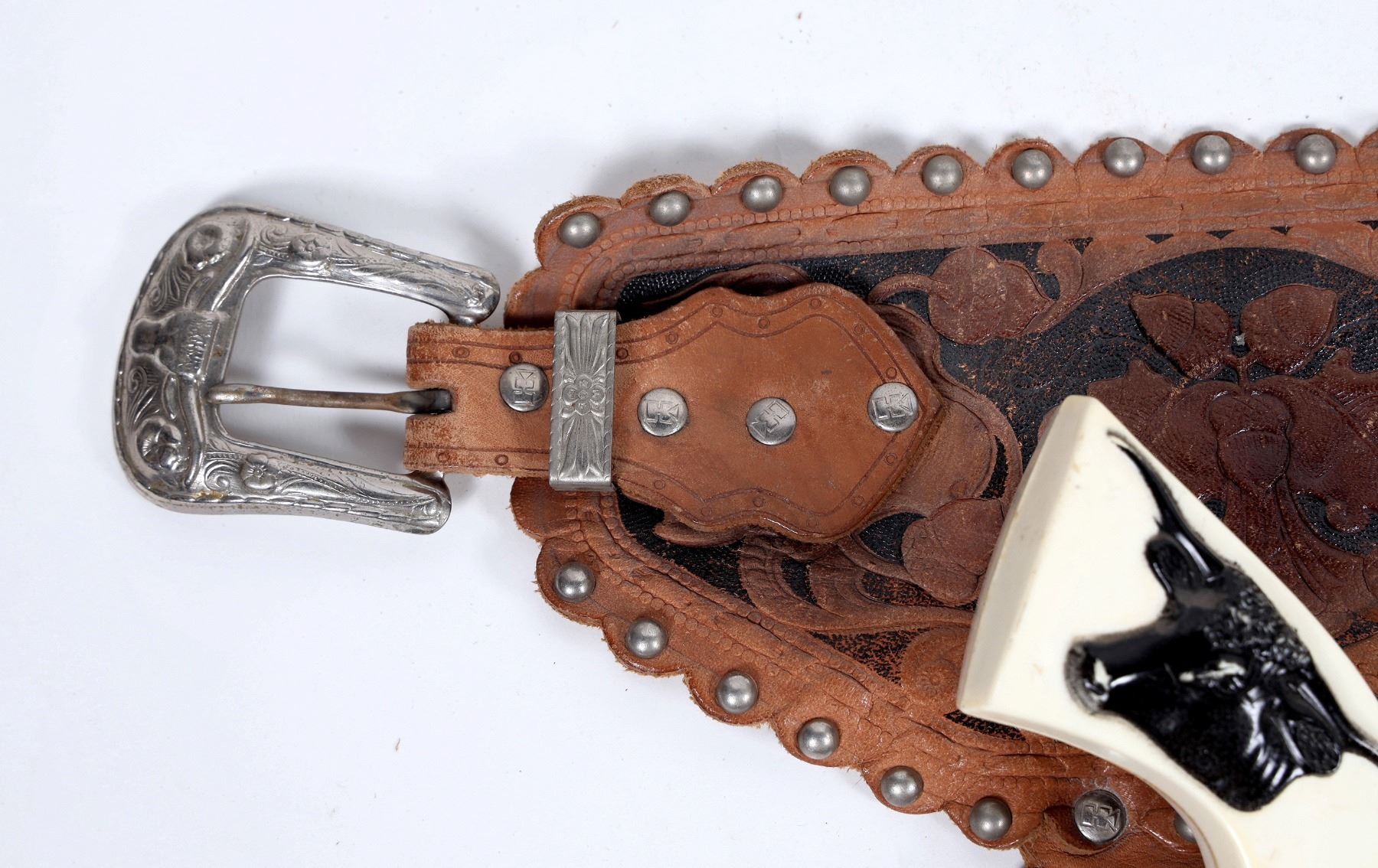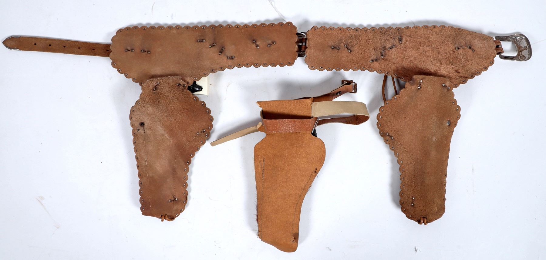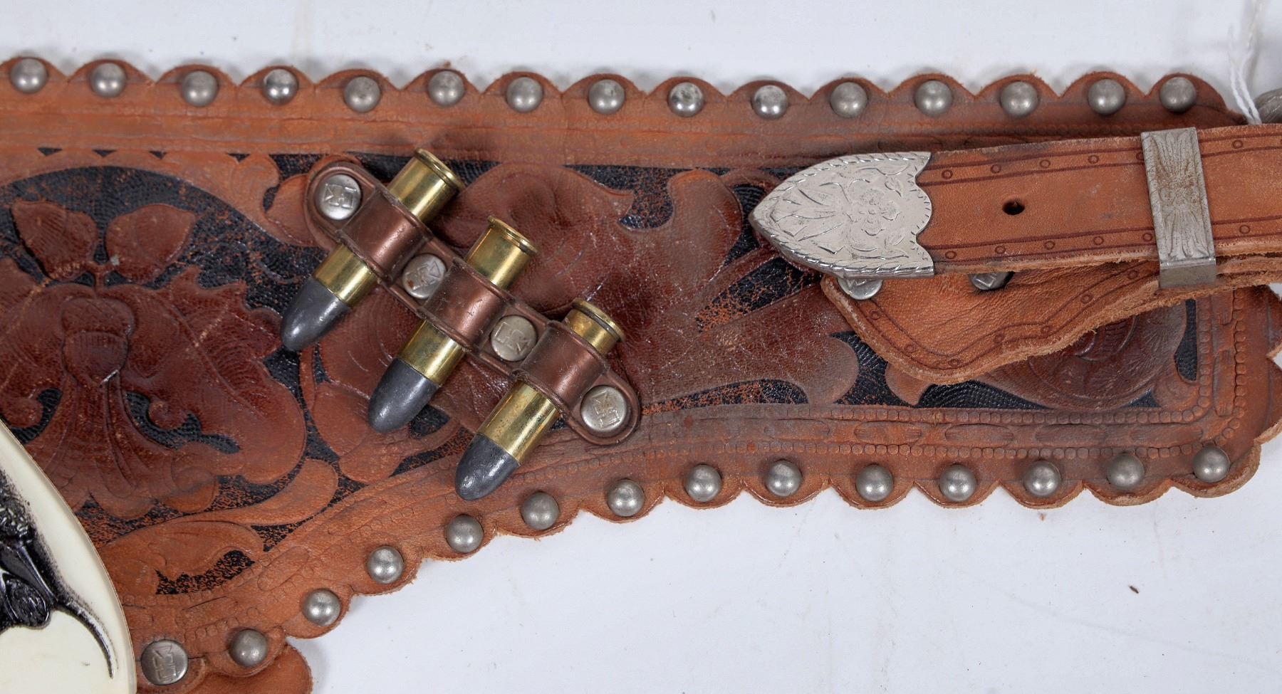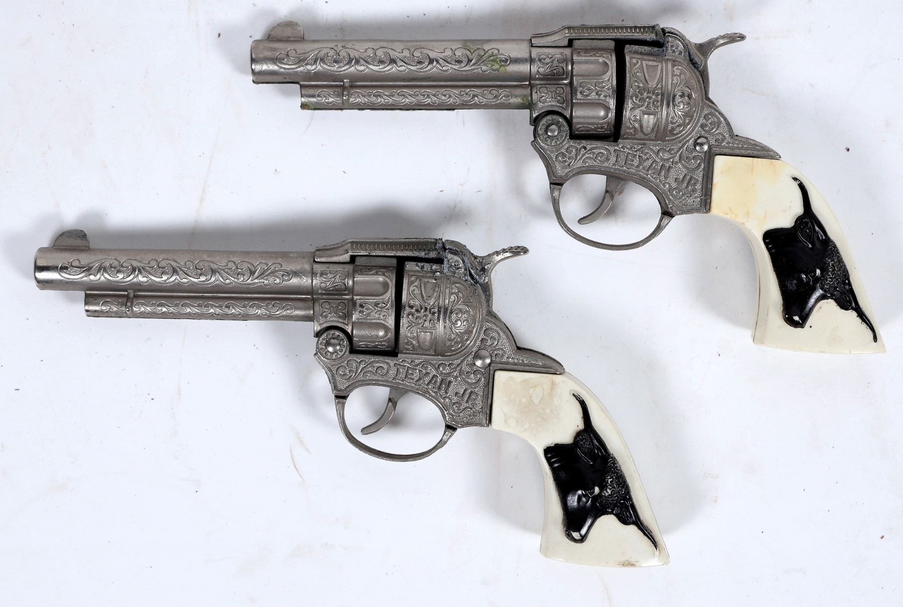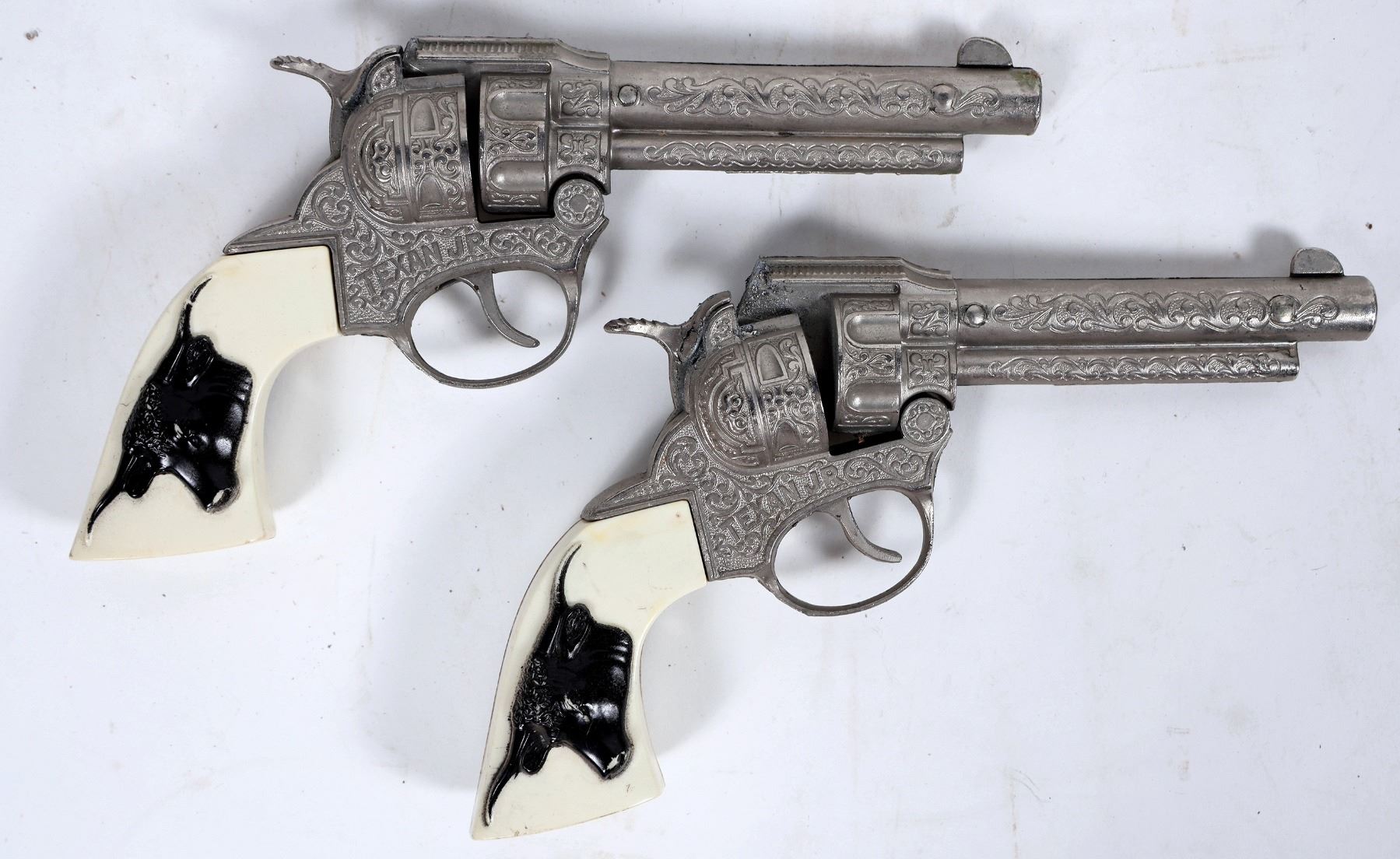 Hubley Texas Jr toy pistol belt, 2 holsters, 2 pistols with black long horn cattle on white plastic faux ivory. The bonus piece here is a single faux toy pistol (not a cap gun) with white longhorn on black background with Texas Jr on the trigger guard, except this toy is a single solid piece. It rests in a cow hide covered holster with a tiny leather belt.
