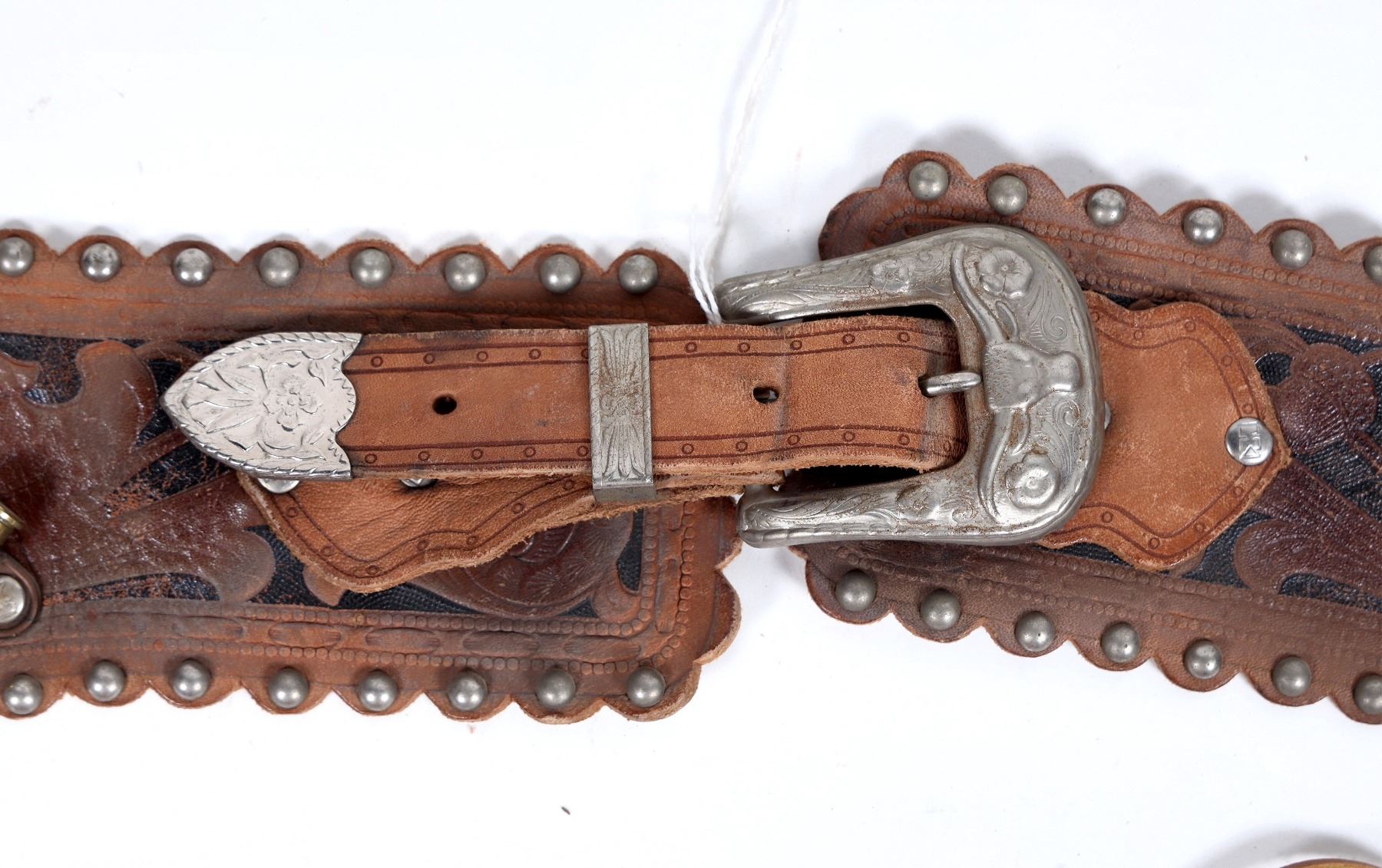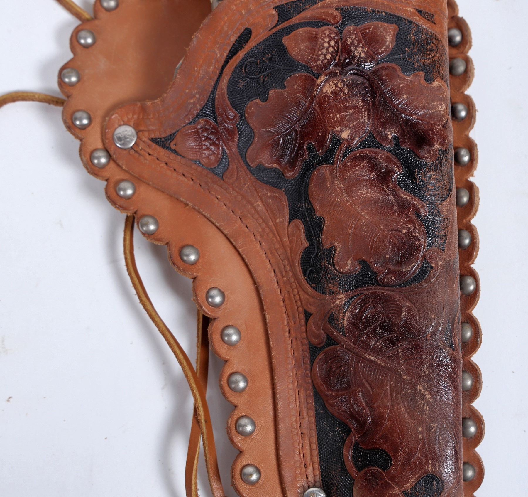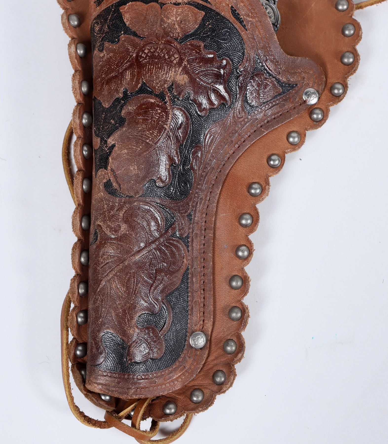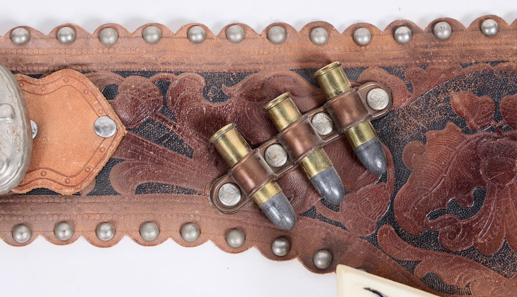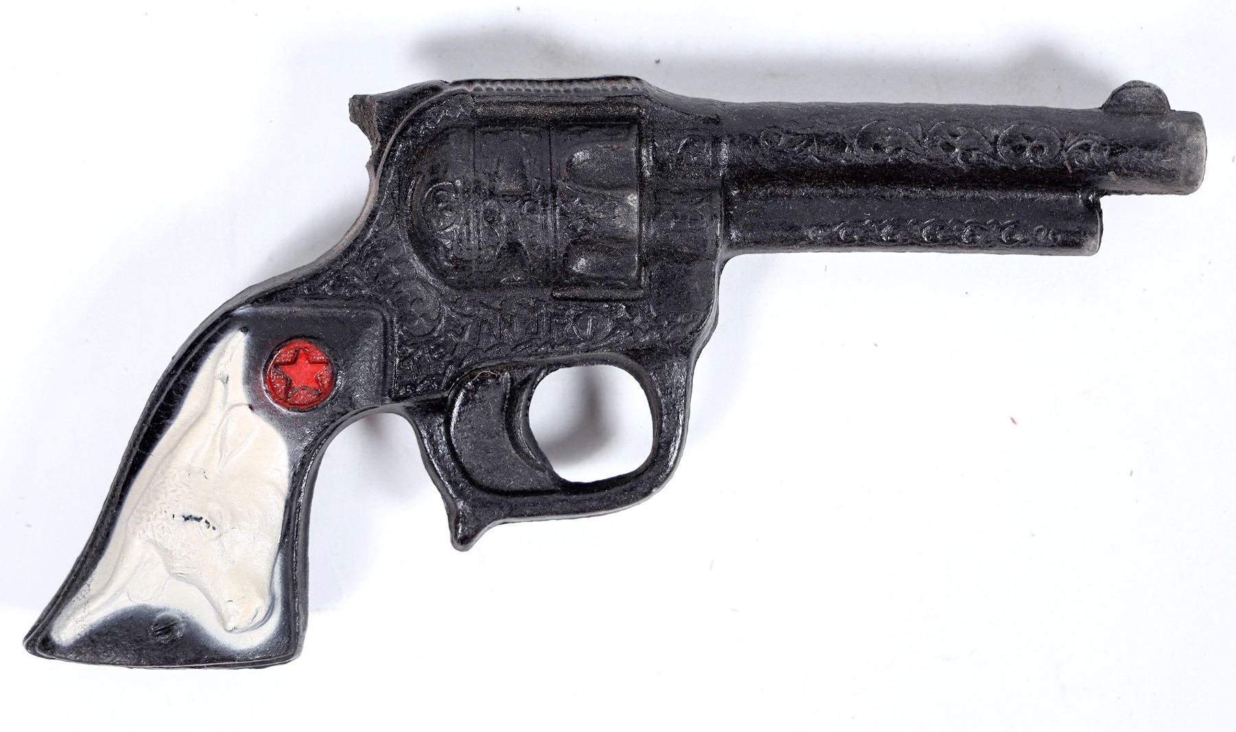 Hubley Texas Jr toy pistol belt, 2 holsters, 2 pistols with black long horn cattle on white plastic faux ivory. The bonus piece here is a single faux toy pistol (not a cap gun) with white longhorn on black background with Texas Jr on the trigger guard, except this toy is a single solid piece. It rests in a cow hide covered holster with a tiny leather belt.