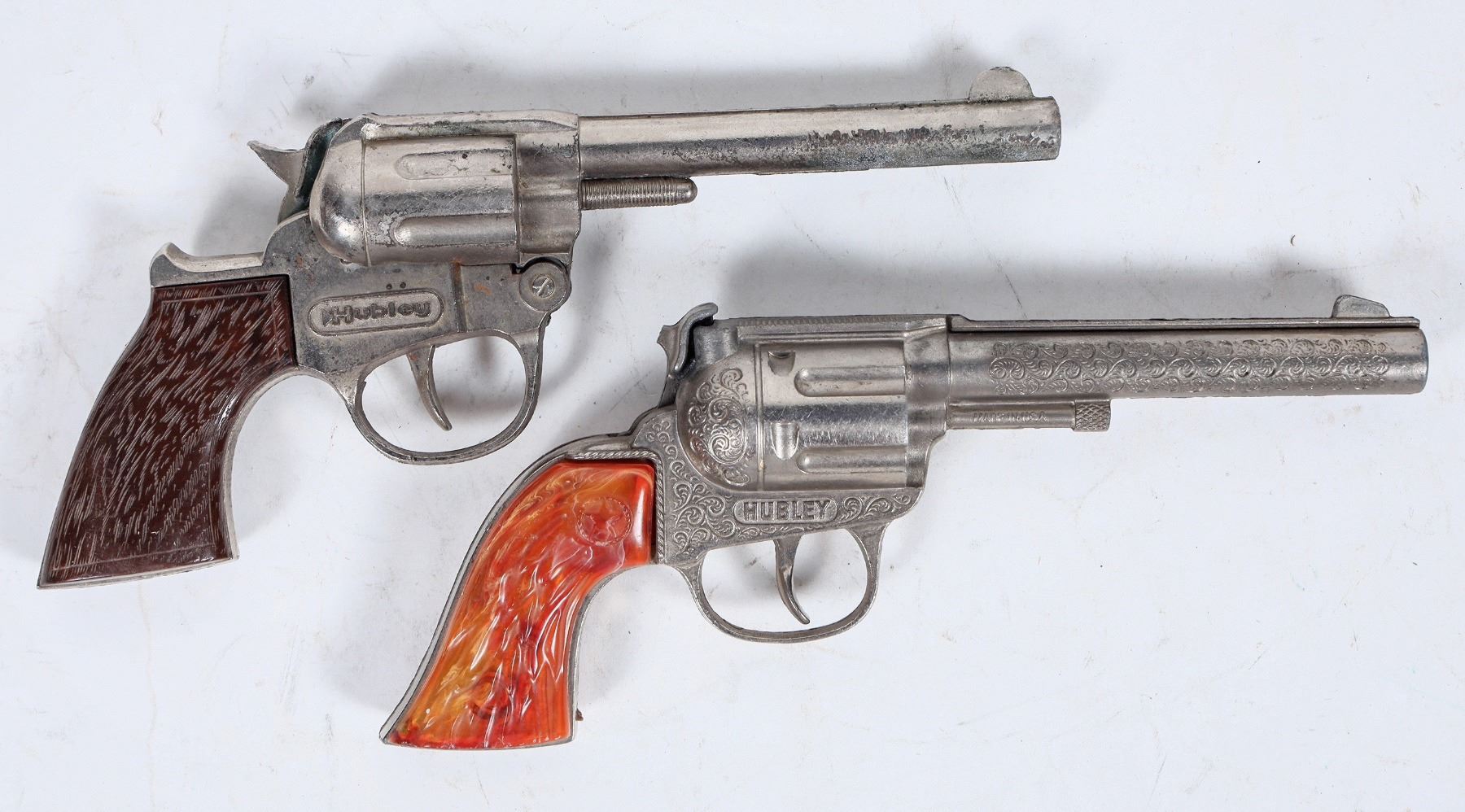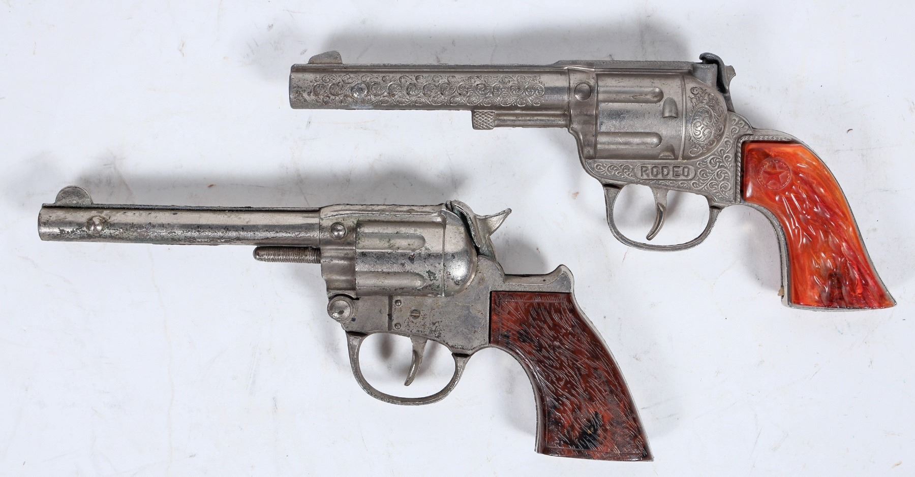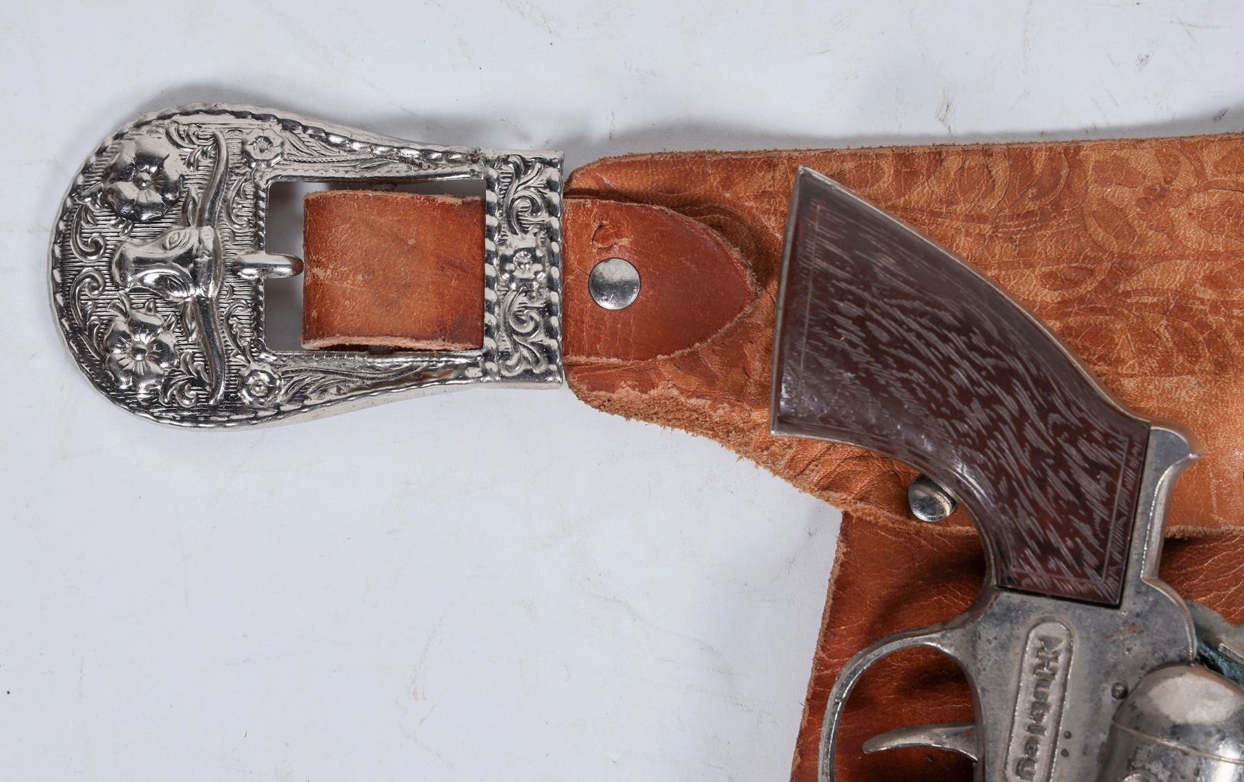 Hubley child's double holster belt. Mismatched pistols, one with yellow-brown faux bone with a star on the handle. the other had a different handle and plain gun. That second pistol has a broken closure latch.