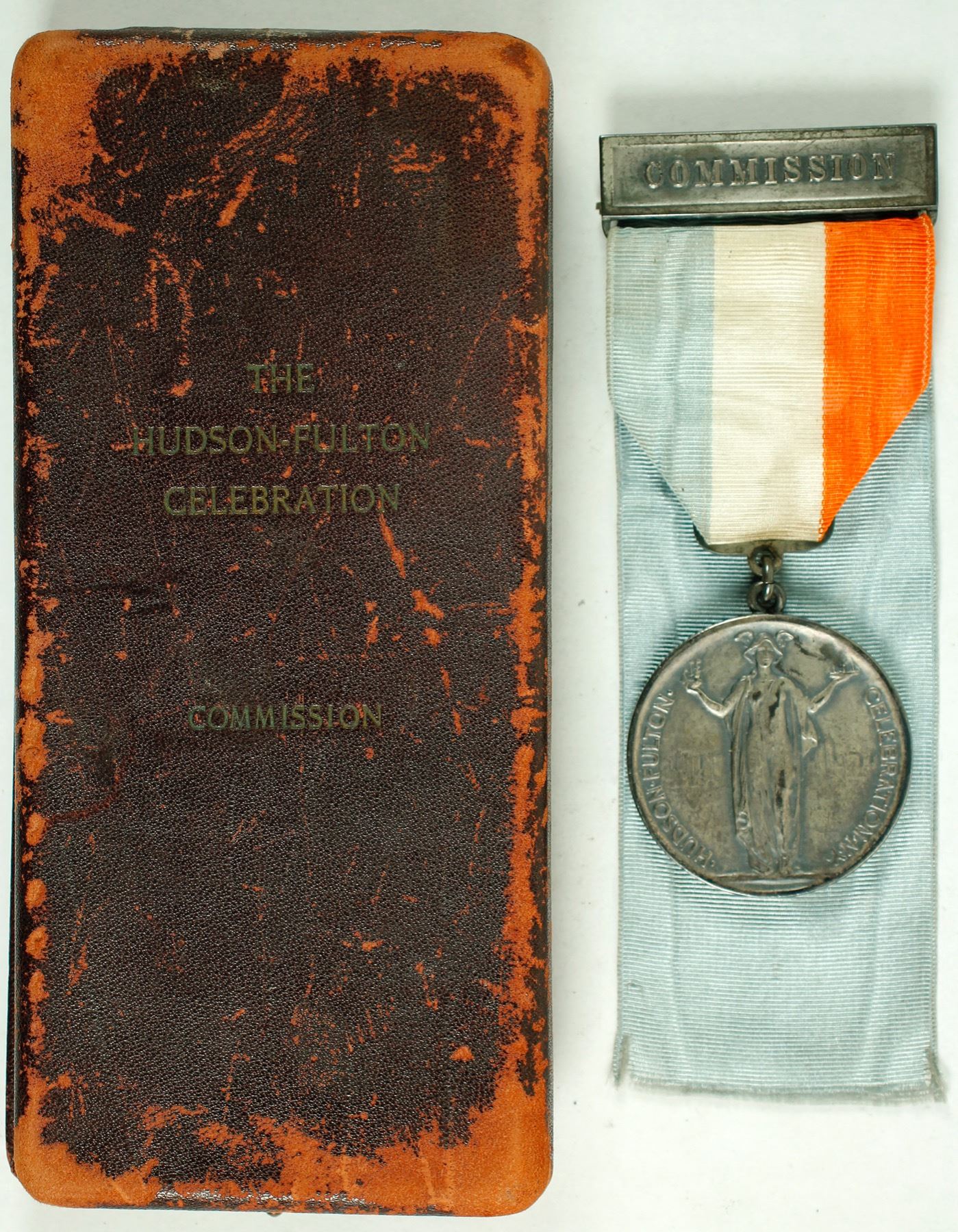 HK 379. R-6. Minted by Tiffany and Company in sterling silver, designed by artist Chester Beach, this Commissioners' Badge is in it's original case. The medallion is about one and a half inches in diameter, suspended from an orange, white and blue ribbon (the colors under which Hendrik Hudson sailed), which when worn was suspended from a silver bar bearing the word "Commissioner," and all of which was backed by a broad blue ribbon about six inches long. The obverse portraits of Hudson and Fulton, surrounded by the legend: "Henry Hudson 1609. Robert Fulton. 1807, and the date of the celebration, 1909. The reverse features a standing, draped, female figure, wearing a winged cap, and holding a model of the Half Moon ship in her right hand and in her left hand a model of the Clermont steamboat. The medal weighs 54.2 grams and is 37 mm. State: New York City: Date: 1909