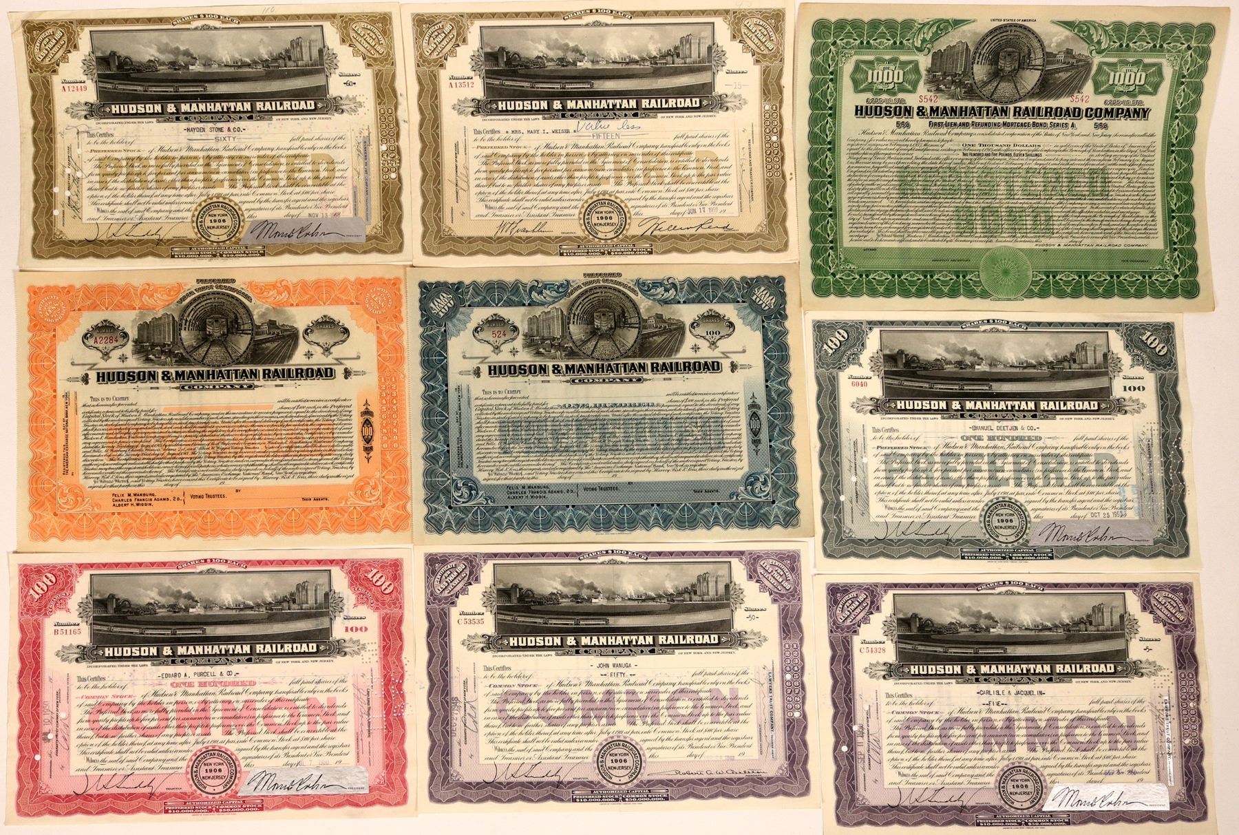 9 certificates. Incorp. 1906 New York and New Jersey. 3 w/vignette of frontal cutaway subway car w/rail yard and harbor on ether side. Orange, Blue stocks and Olive $1000, 5% Mortgage Bond, all unissued/uncanceled, Republic Bank Note printer. 6 w/vignette side view cutaway of subway tunnel under the Hudson. 2Olive, Blue, 2 Purple, Red. Issued 1950-59, American Bank Note Co printer.