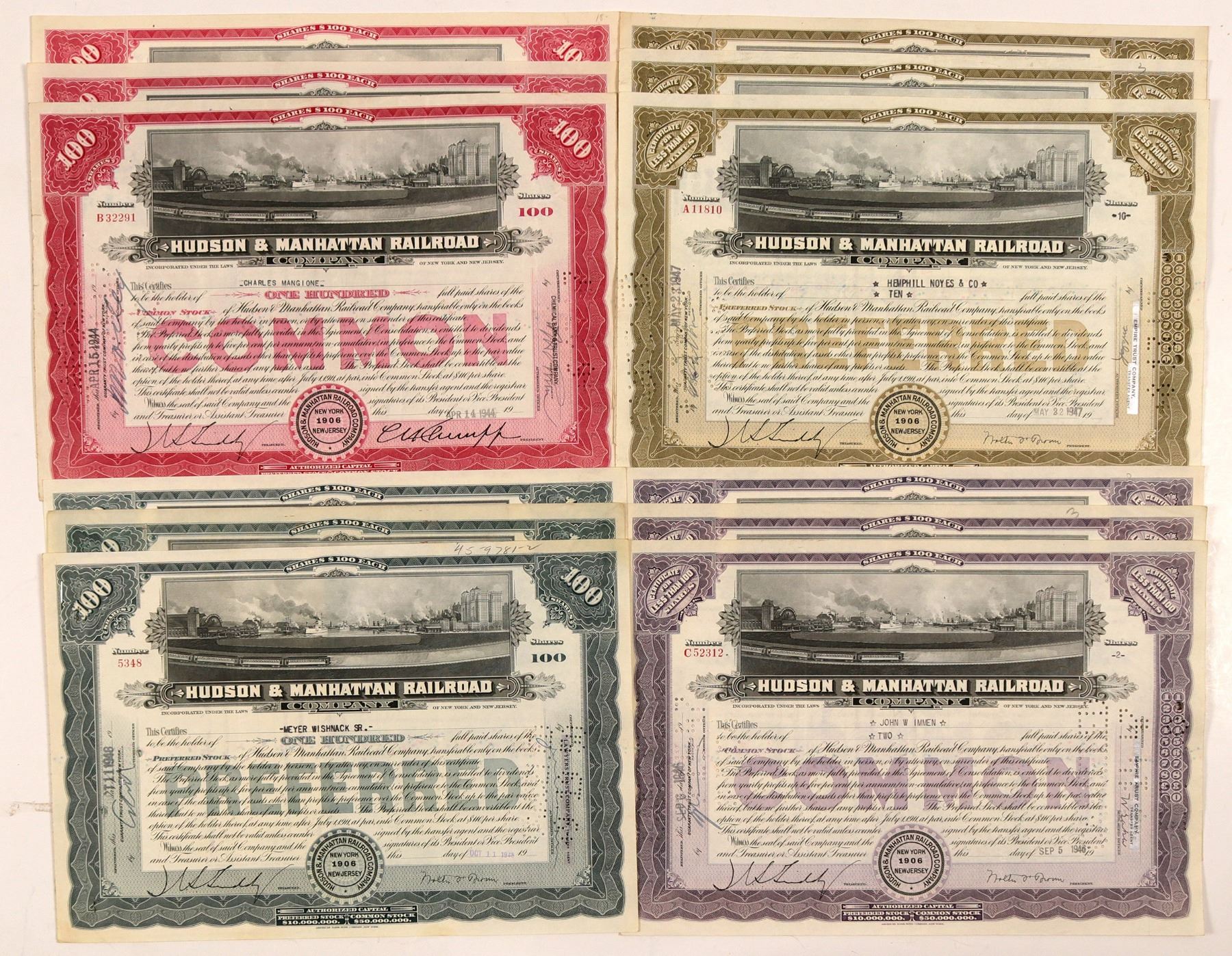 Lot of 12, 3 each of four varieties. Issued 1944-1950, punch cancelled. Red, green, purple, or blue borders. Great vignette of train with Hudson River and the city in the background. Printed by ABN. 8.25 x 12" Opened in 1908. Commonly known as "the Tubes." Operated until 1962 when taken over by the Port Authority of New York and New Jersey and re-named PATH - Port Authority Trans-Hudson. Ken Prag Collection