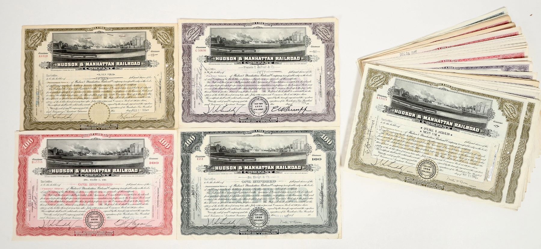 Group of approx. 70 stock certificates from the Hudson & Manhattan Railroad Company, issued 1932 to 1950. All are issued and cancelled. Lot includes blue, red, purple, and olive green varieties of the certificates. Interesting vignette of an undersea railroad tunnel. 12"x8.5" certs in varying condition; see photo for details.