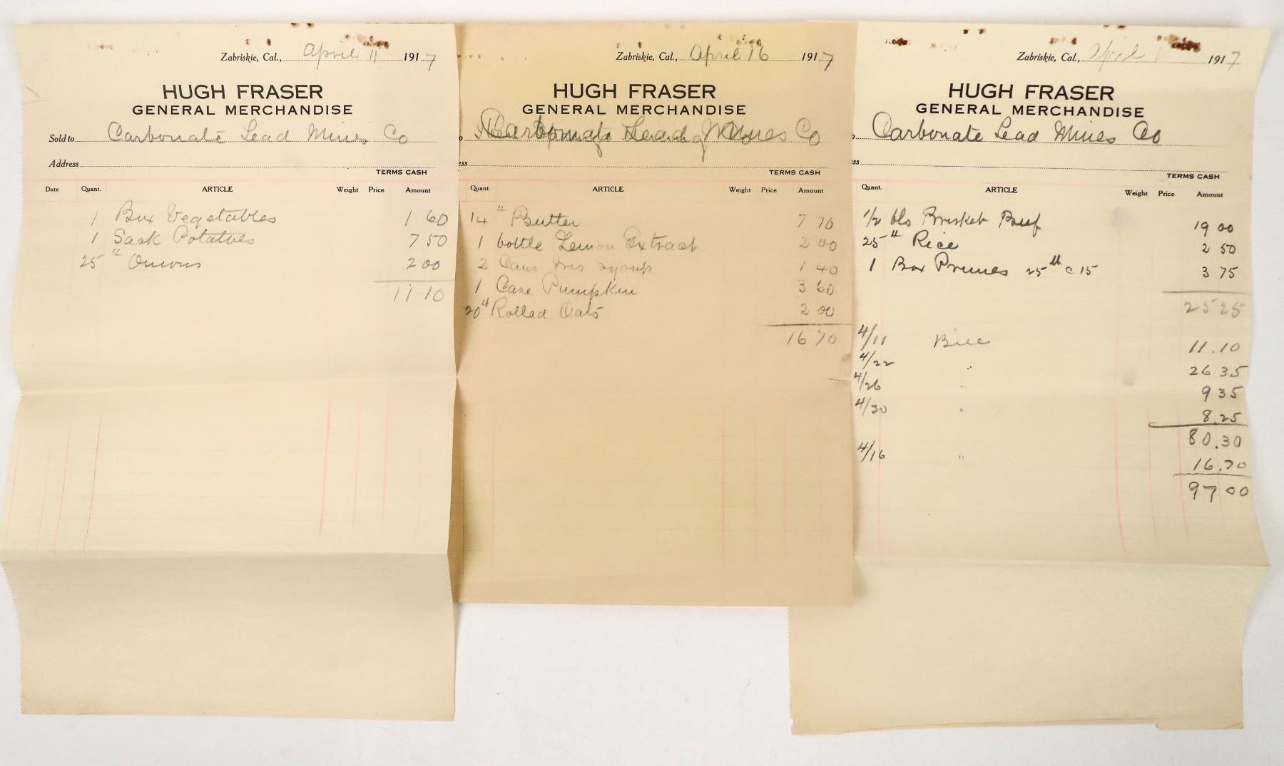 Only known, 3 1917 Hugh Fraser, General Merchandise billheads to Carbonate Lead Mines Co. "Zabriskie's life took on new meaning in 1885 when F.M. Smith hired him to supervise several hundred Chinese workers at the Columbus Marsh area of the Pacific Coast Borax Company near Candelaria. This was the beginning of a life-long career in the field of Borax. He ultimately became vice president and general manager of the company and served in that capacity for thirty-six years until his retirement in 1933. During this time the Pacific Coast Borax Company had phased out most of its borax operations in the Candelaria vicinity and had moved further production into the Death Valley area.' from nps.
