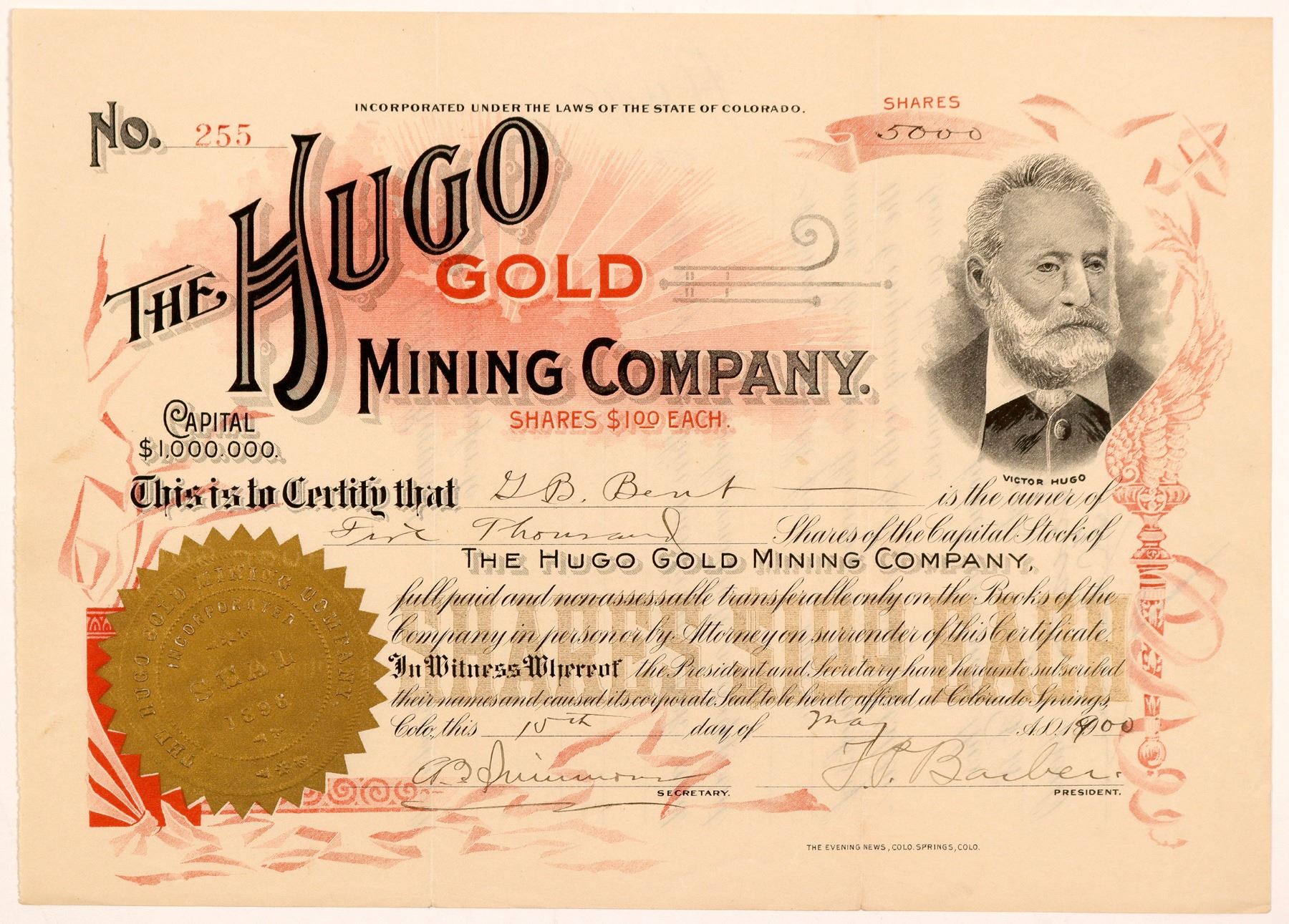 Fantastic! Not listed in Hills. Inc. in Colorado. No. 255, issued for 5,000 shares to GB Bent on May 15th, 1900 in Colorado Springs. Signed by president T.P. Barber and the secretary (illegible). Not cancelled. Gold seal, black and red print, red floral underprint design. Portrait vignette of Victor Hugo. Printed by the Evening News, Colo. Springs. Folds. 7 x 9.5" The United States Investor, Volume 13, Issue 27, 1902 discusses a Victor Hugo Gold Mining Company of Cripple Creek that worked the Pay Car Lode, the H.E. Lode, and the E.D.F. Lode. We could not locate any more information. Ken Prag Collection