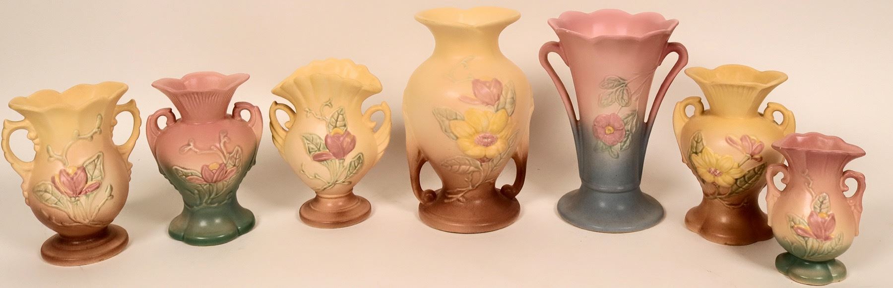 Five vases from Hull, including two 8.5" vases, two 6", one 4" and two 6.25" vases. All in good condition.
