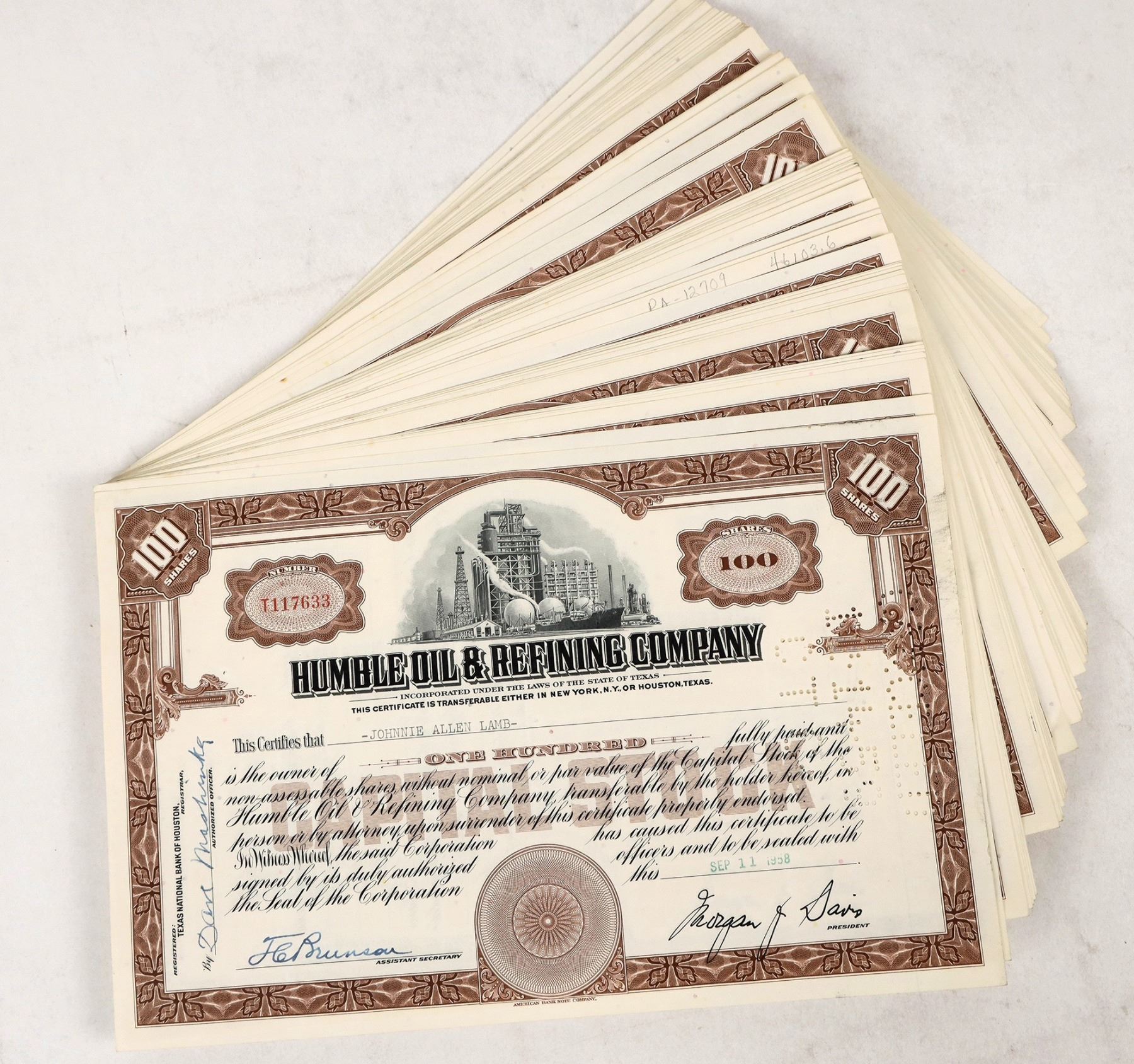 Group of approx. 90 stock certificates from the Humble Oil & Refining Company, issued 1957 and 1958. All issued and cancelled w/ hole punch cancellations. Nice vignette of an oil refinery with derricks in the background. All in great condition; see photos.