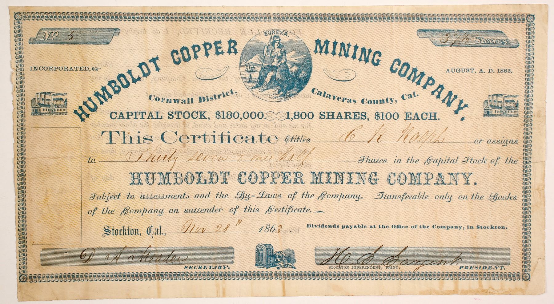 Another Prag stock we have not seen before. NUMBER 5 for 37 1/2 shares to C Ralph. Signed by DA Meade and president HS Sargent. Not cancelled. Winkles and border discoloration that intrudes on bottom and left of stock. California seal vignette. Stockton Independent Print. Blue border and script on safety paper. Dateline Stockton 1864. Incorporated August A. D. 1863. Two smaller mill vignettes. The only possible reference we found to this company was in the November 1, 1864 Sacramento Daily Union where 'Humboldt Copper' sold for $10 a foot. Which was a far cry from Gould & Curry which sold for $1605 a foot. Prag Collection