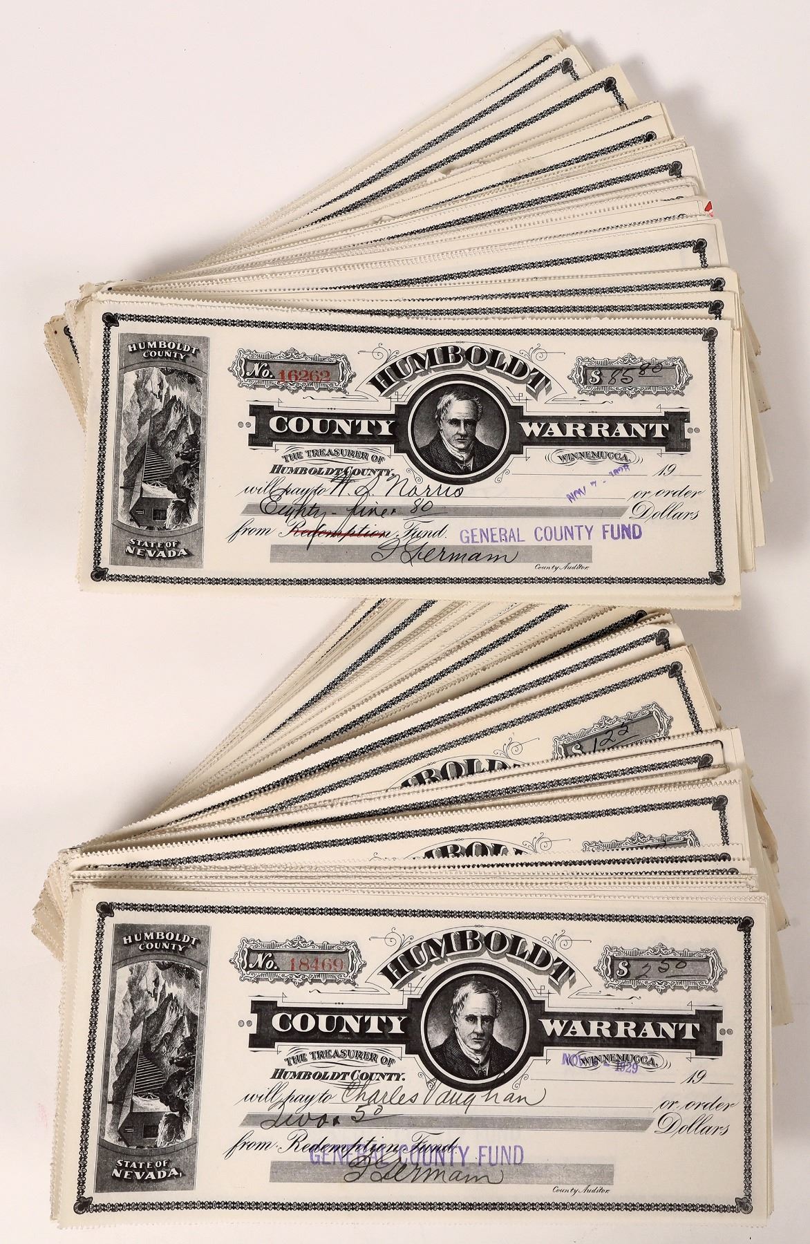 Hoard of approx. 600 issued Humboldt County Warrants. Issued by the treasurer of the county. Dateline Winnemucca. Signed by the County Auditor. Portrait vignette of a man (center) and mining vignette (left).