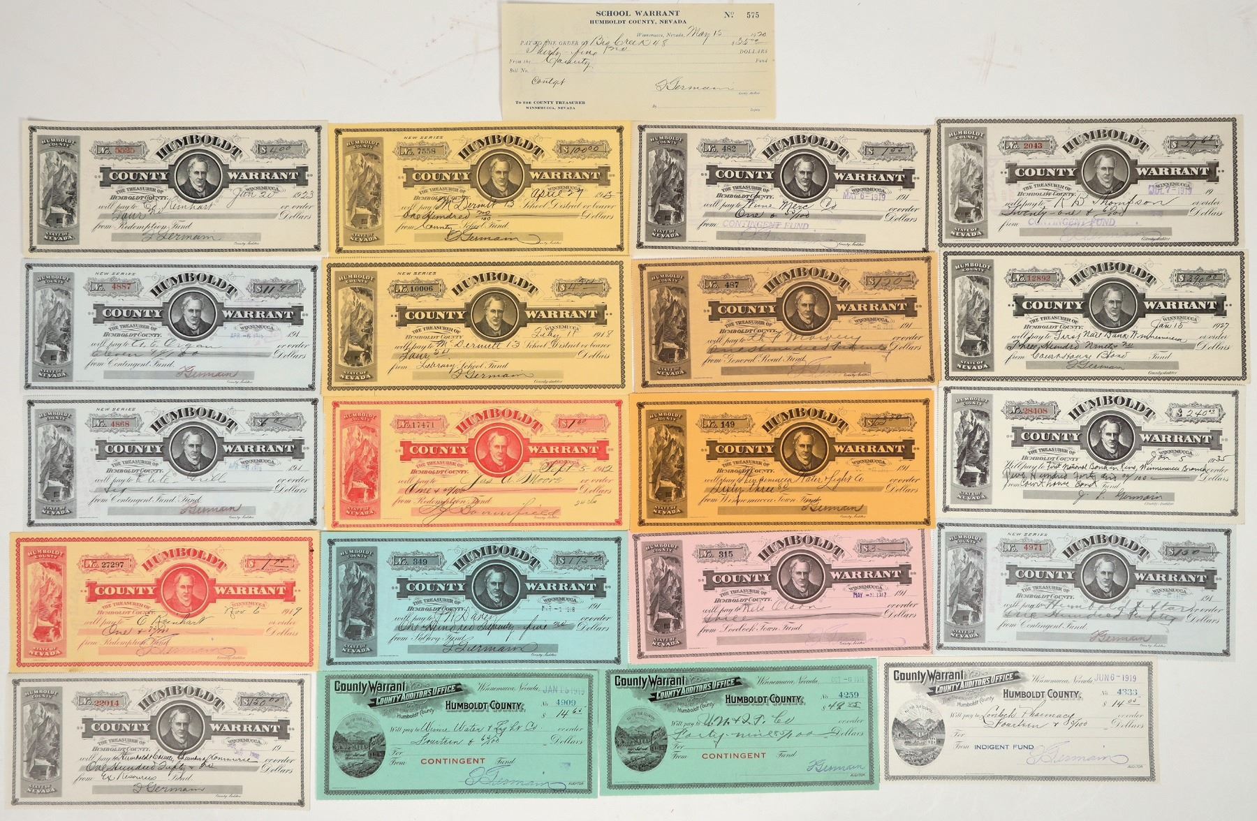 Group of 21 Humboldt County, Nevada, Warrants, 1912-1935. This multi-color group, in several printing varieties, represents numerous county funds. All are in excellent condition.