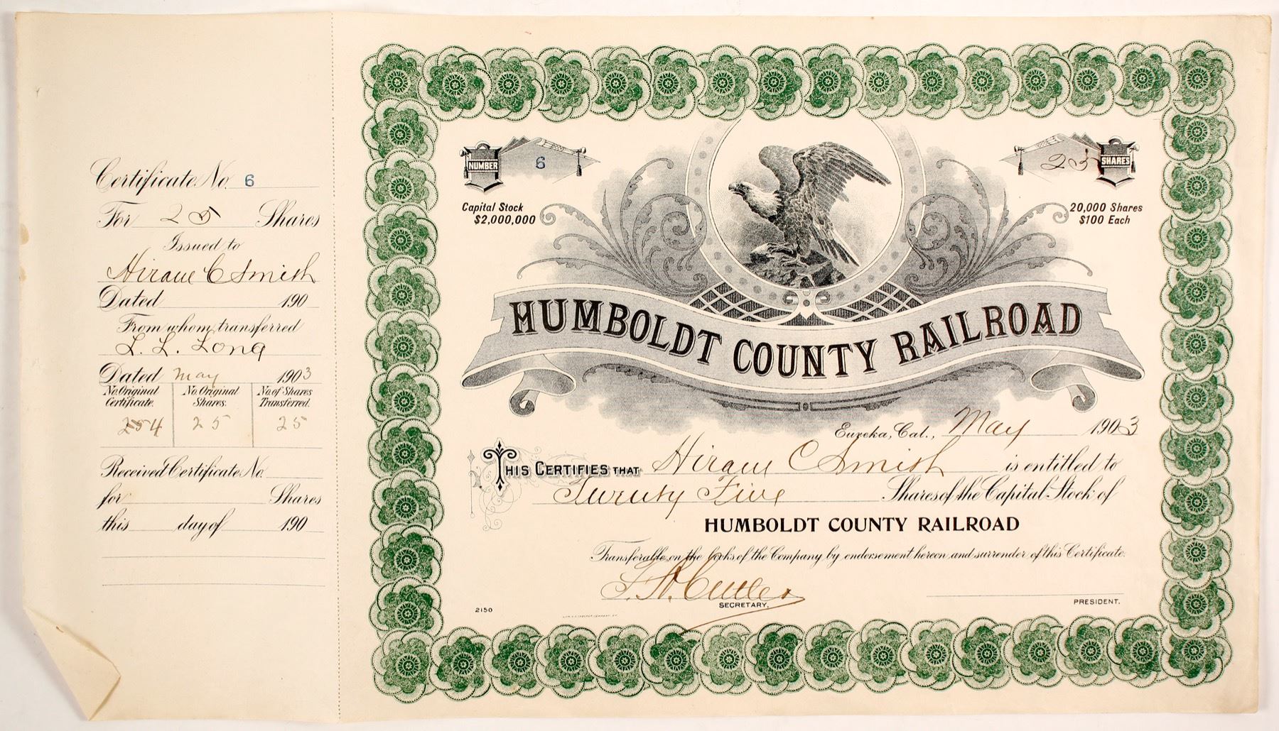 25 shares of Humboldt County Railroad, cert. # 6 issues to Hiraue C. Smith May, 1903 signed by F. H. Cutler, secy. Eagle Vignette. Listed in Cox. Printed: Lith H.S. Crocker Co. SF. Prag collection. City: Eureka, Humboldt County State: California Date: 1903