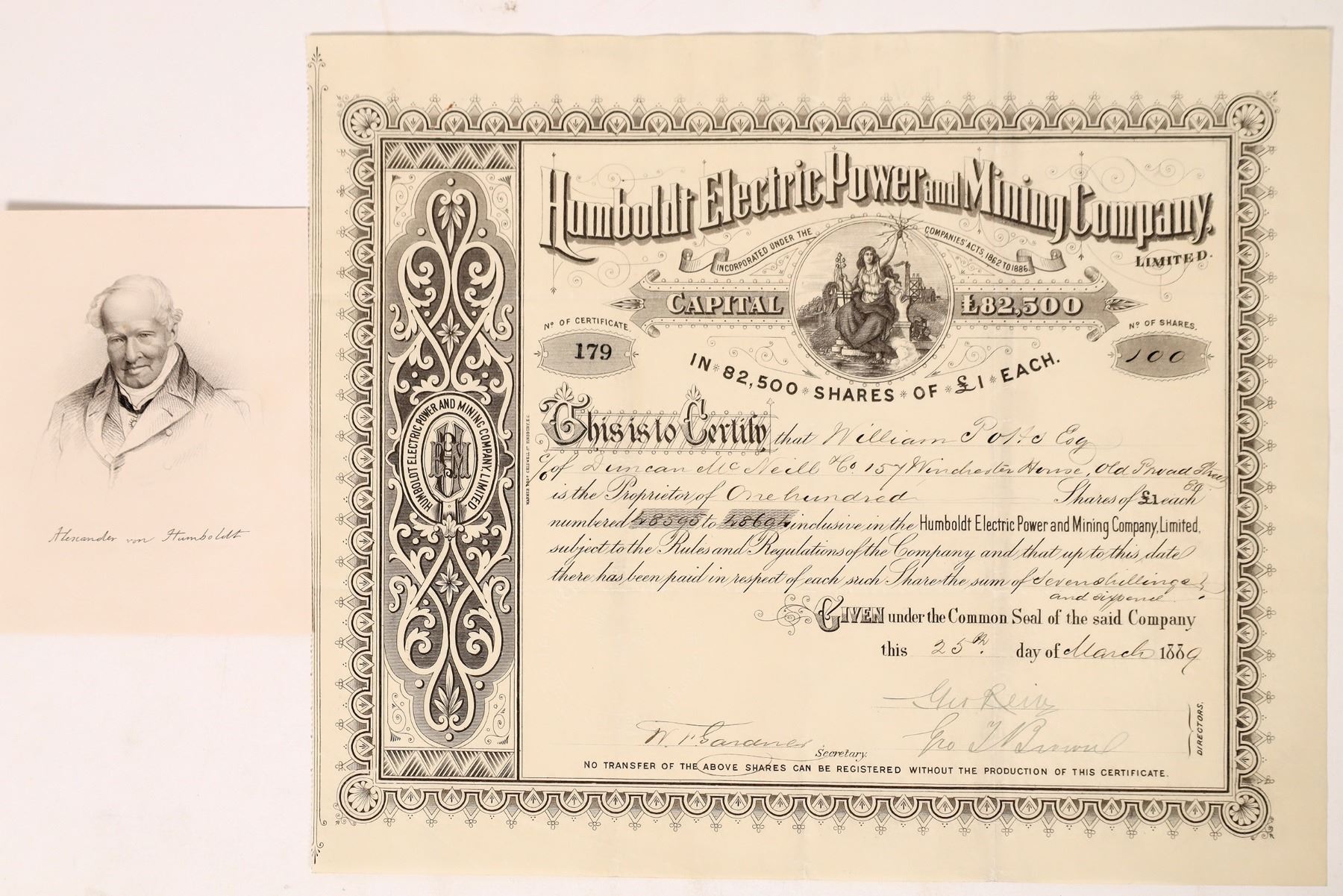 Humboldt Electric Power & Mining Company Ltd. Stock Certificate #179 issued to William Potts for 100 shares at 1 pound each on Mar 25, 1889. Shares numbers 48595 to 48691. Signed by 2 directors, G. Reinz(?) and Geo. I. Brown and secretary W.R. Gardner. Black, ornate border and print on beige paper by Warner Pros., Finsbury, E.C. To the left, an elaborate Company logo, center top vignette. Includes a very fine vignette of Alexander von Humboldt. This is a British financed Company operating in the US, the location of the Company, however, was not found. According to wikipedia: "Friedrich Wilhelm Heinrich Alexander von Humboldt (14 September 1769 – 6 May 1859) was a German polymath, geographer, naturalist, explorer, and proponent of Romantic philosophy and science. Between 1799 and 1804, Humboldt travelled extensively in the Americas, exploring and describing them for the first time from a modern Western scientific point of view. Humboldt is seen as "the father of ecology" and "the father of environmentalism" today." He has had a huge impact on the American mindset at the time. Herzog Collection. Herzog Collection