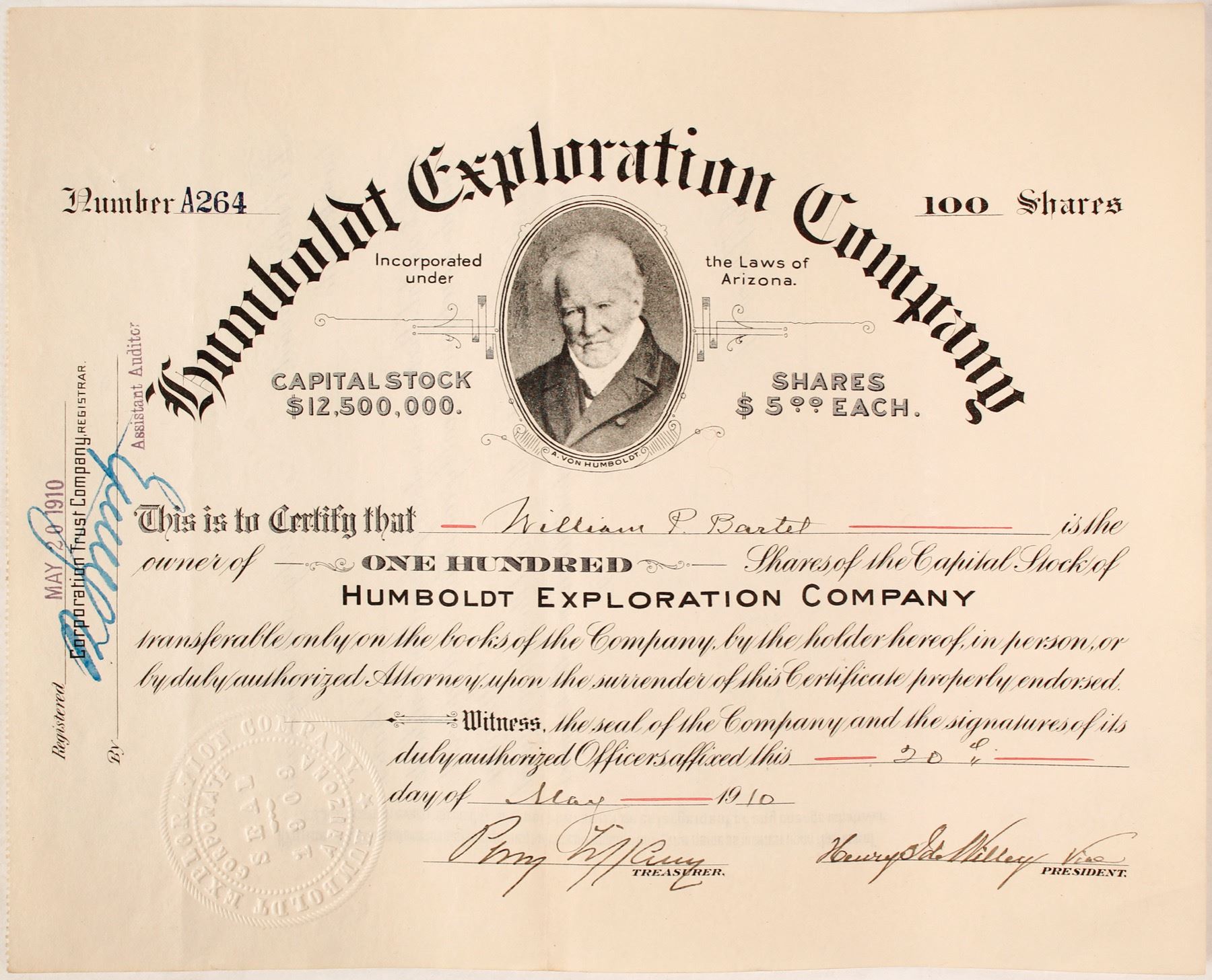 Unique vignette is of A. Von Humboldt. Number A264 for 100 shares issued to William P Bartel. Signed by Henry Willey and (?). Incorporated in 1909 under the Laws of Arizona - this company was in search of fossils, especially in the Kimmswick Limestone site for a museum in St. Louis. [Archaeology in America: An Encyclopedia] This company may also have owned or controlled the the following mining companies: Zumate - Esperanza Mining Co., La Gloria - Success Mining Co., Ste Ana de Capula Mining Co., Capula No. 2 Mining Co., Vizcayua Mining Co., and Willey - Cananea Copper Co. These companies were south of the border in Mexico and produced gold, silver and copper ores. (Ref. The Mexican Year Book - Copyright 1911) Henry I Willey, president of the Humboldt Exploration Company, must be who the last mine was named for. [oldwesthistorystore.org] Friedrich Wilhelm Heinrich Alexander von Humboldt was a Prussian polymath, geographer, naturalist, explorer, and influential proponent of Romantic philosophy and science. He was the younger brother of the Prussian minister, philosopher, and linguist Wilhelm von Humboldt. Humboldt's quantitative work on botanical geography laid the foundation for the field of biogeography. Humboldt's advocacy of long-term systematic geophysical measurement laid the foundation for modern geomagnetic and meteorological monitoring. He is honored throughout Nevada (Humboldt River, Humboldt County, Humboldt Range, Humboldt Sink). (Laguna Collection) State: Arizona City: Date: 1910 HWAC# 59599