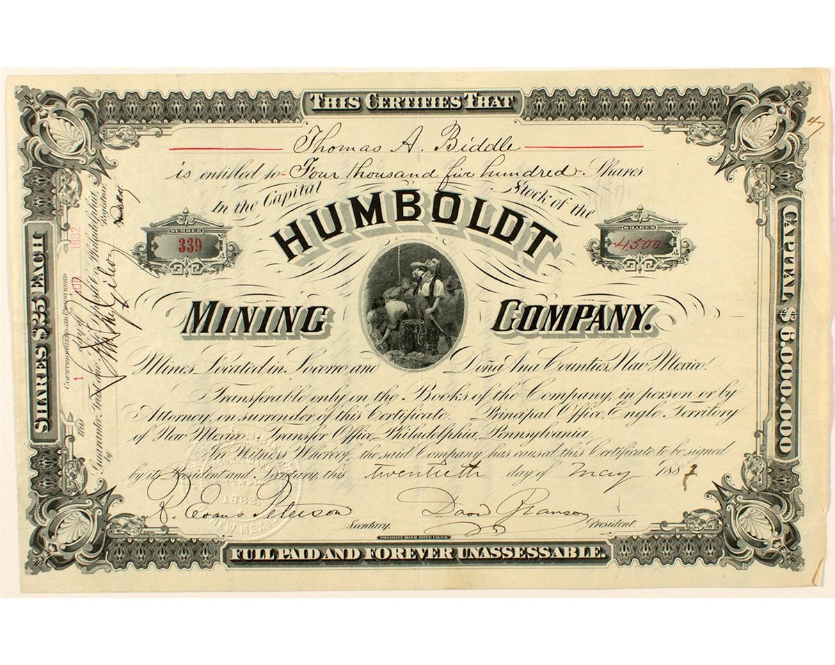 Cert. #339, issued to Thomas A. Biddle. Incorporated in New Mexico. Signed as president by David Pearson and R. Evans Peterson as secretary. Mines located in Socorro and Dona Ana Counties, New Mexico printed on certificate. Circle vignette of two miners working underground. The company incorporated in New Mexico in 1882. Franklin Bank Note Company, New York. VF. Uncancelled.City: SocorroCounty: Dona AnaState: NMDate: